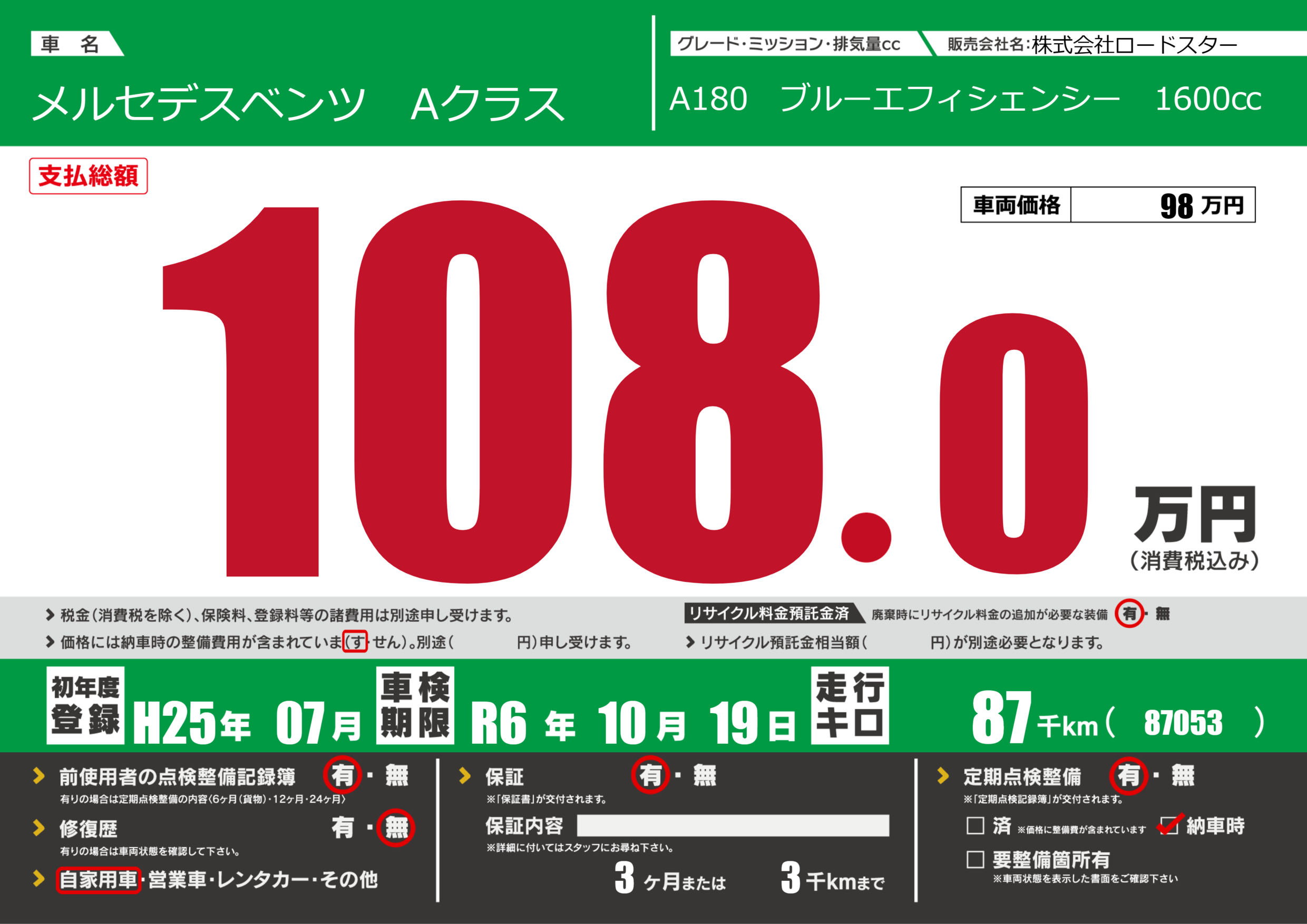 | 定期点検整備 | 定期点検整備あり 納車時あり | ||