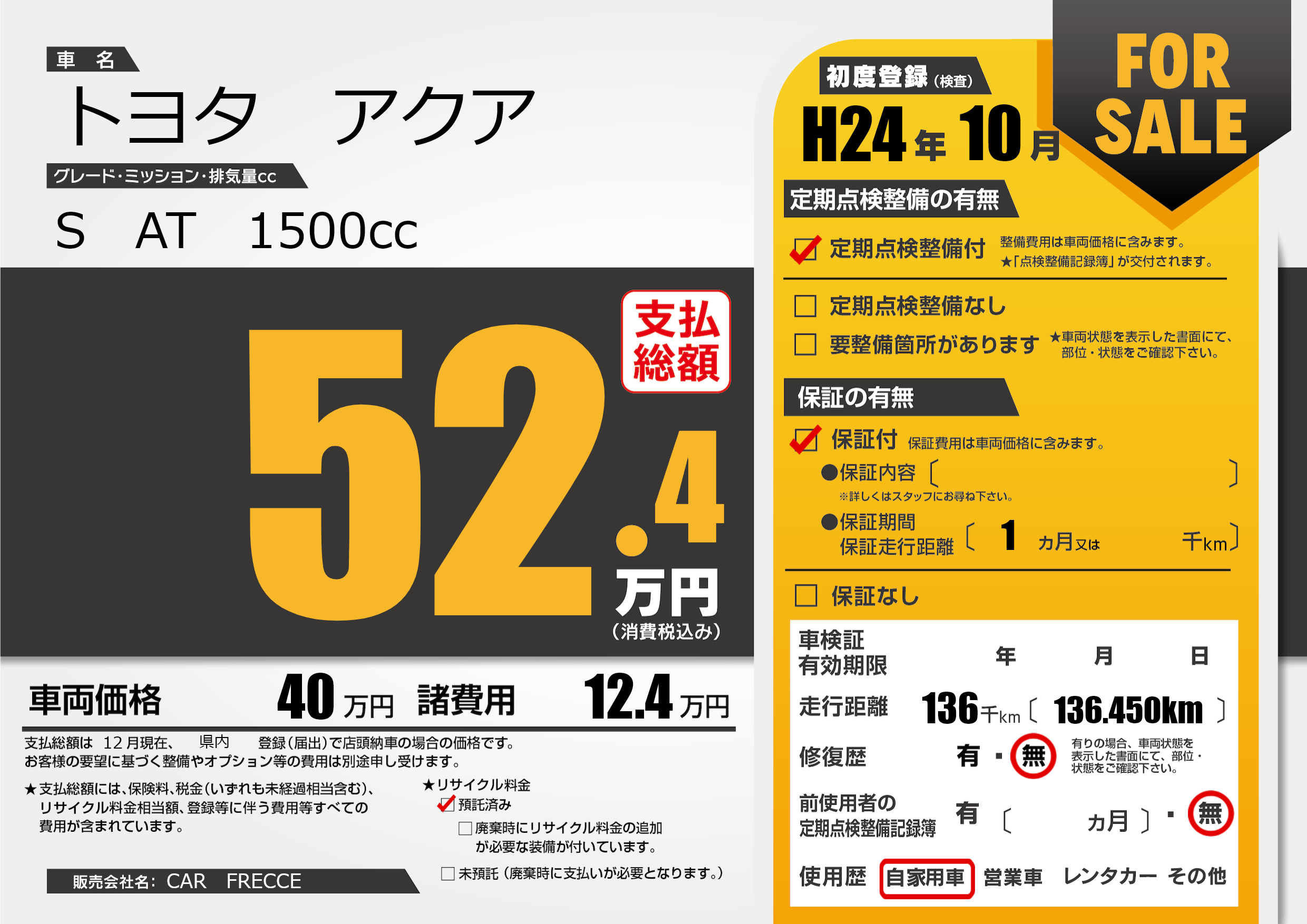 | 車名 | トヨタ アクア | グレード ミッション 排気量 |