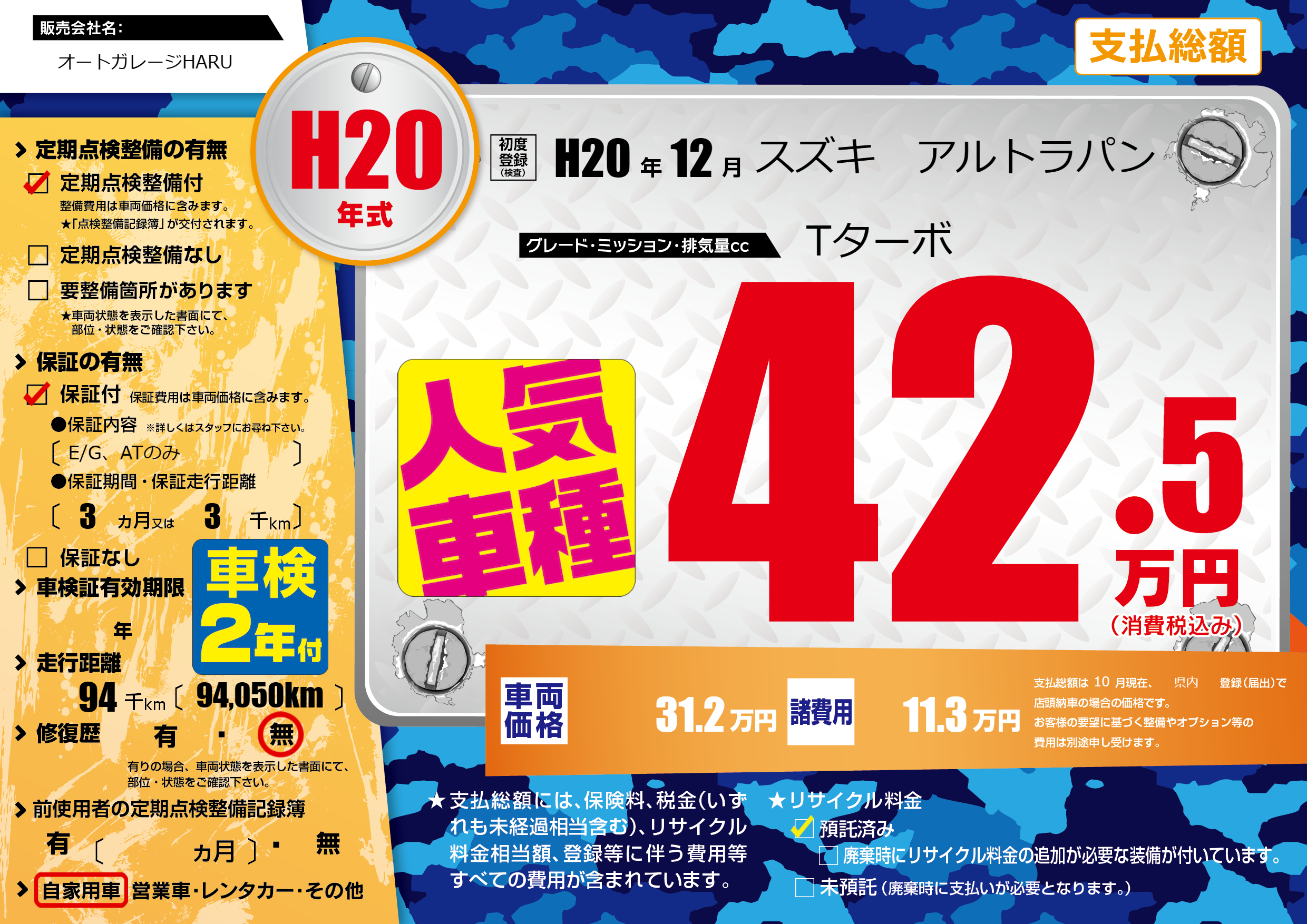 | 走行キロ | 9.4万km | 初年度登録 | H20年12月 |