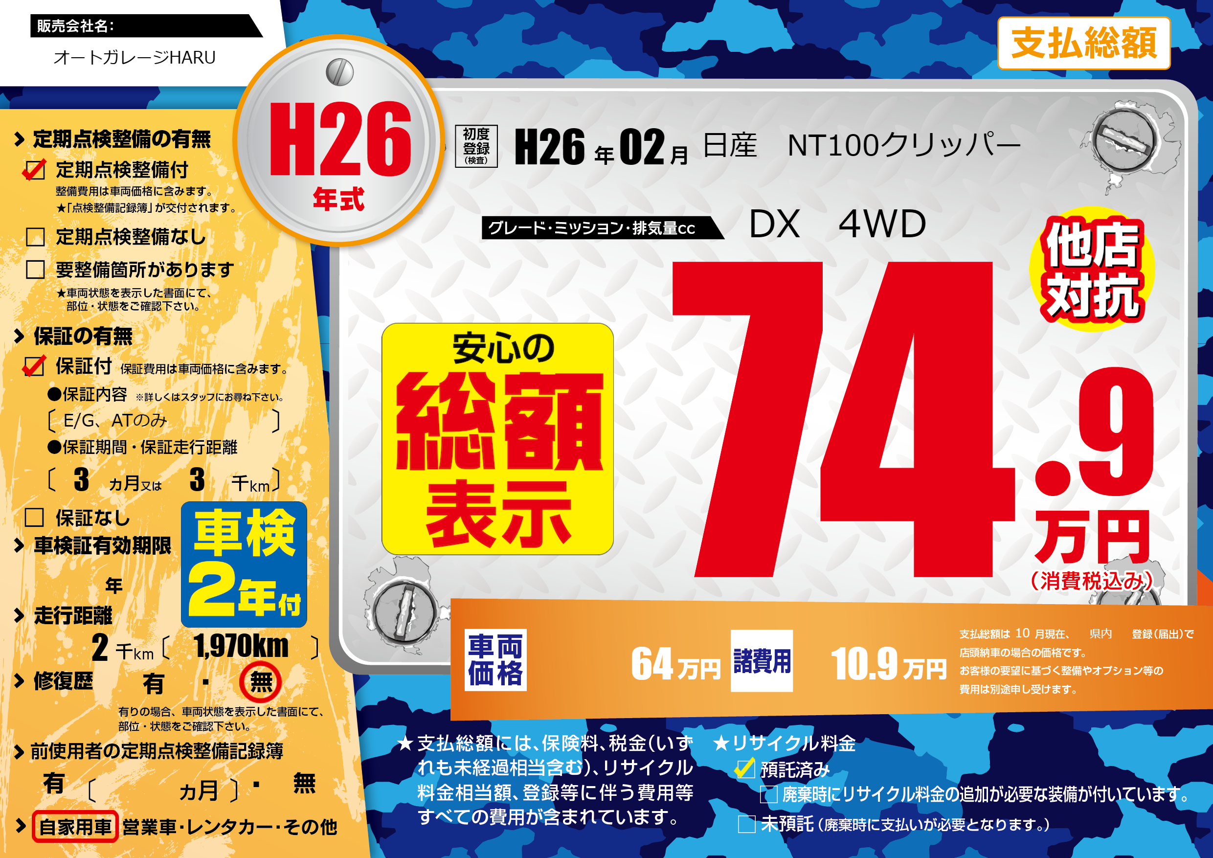 | 車名 | 日産 NT100クリッパー | グレード ミッション 排気量 |