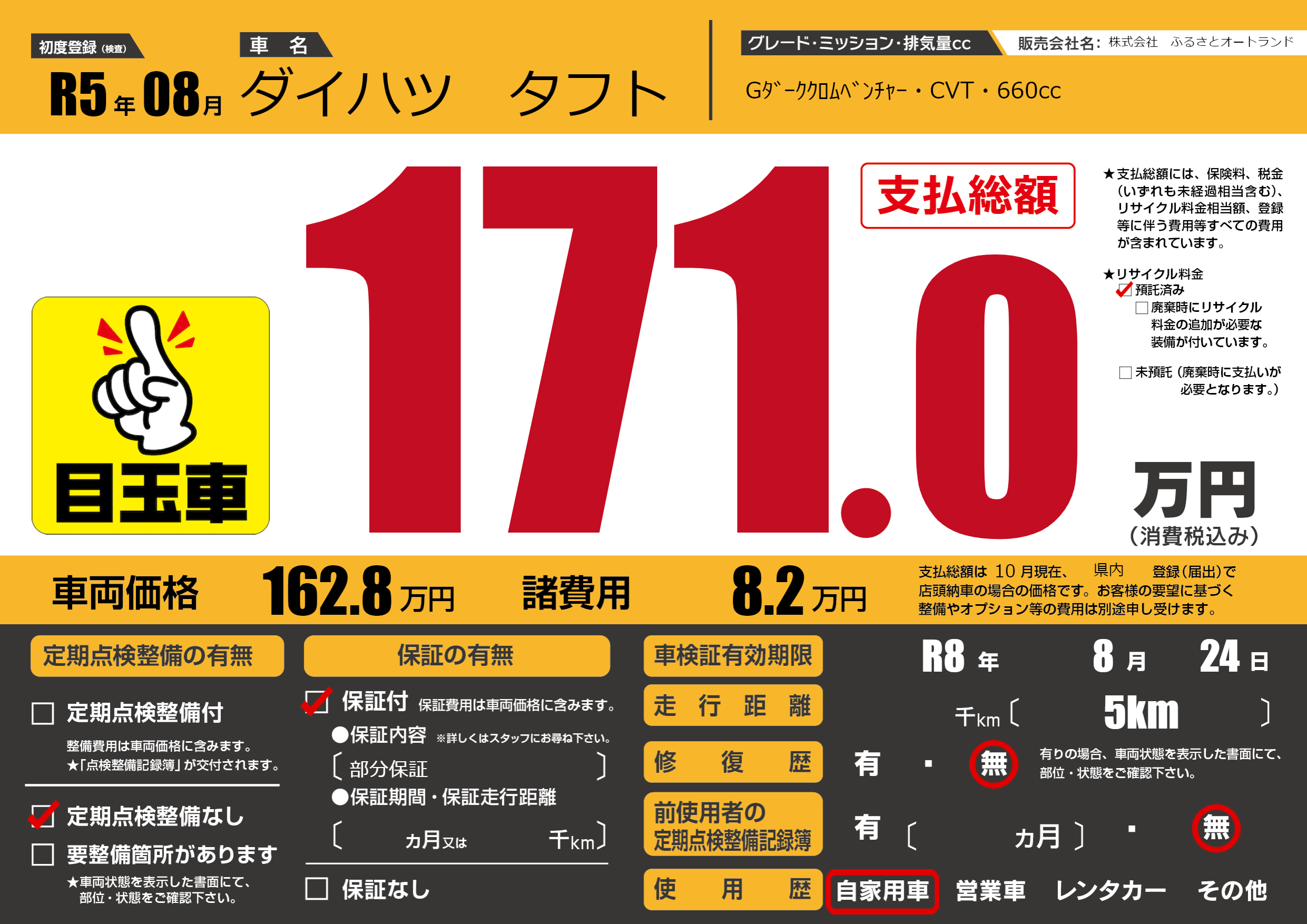 | 走行キロ | - | 初年度登録 | R5年08月 |