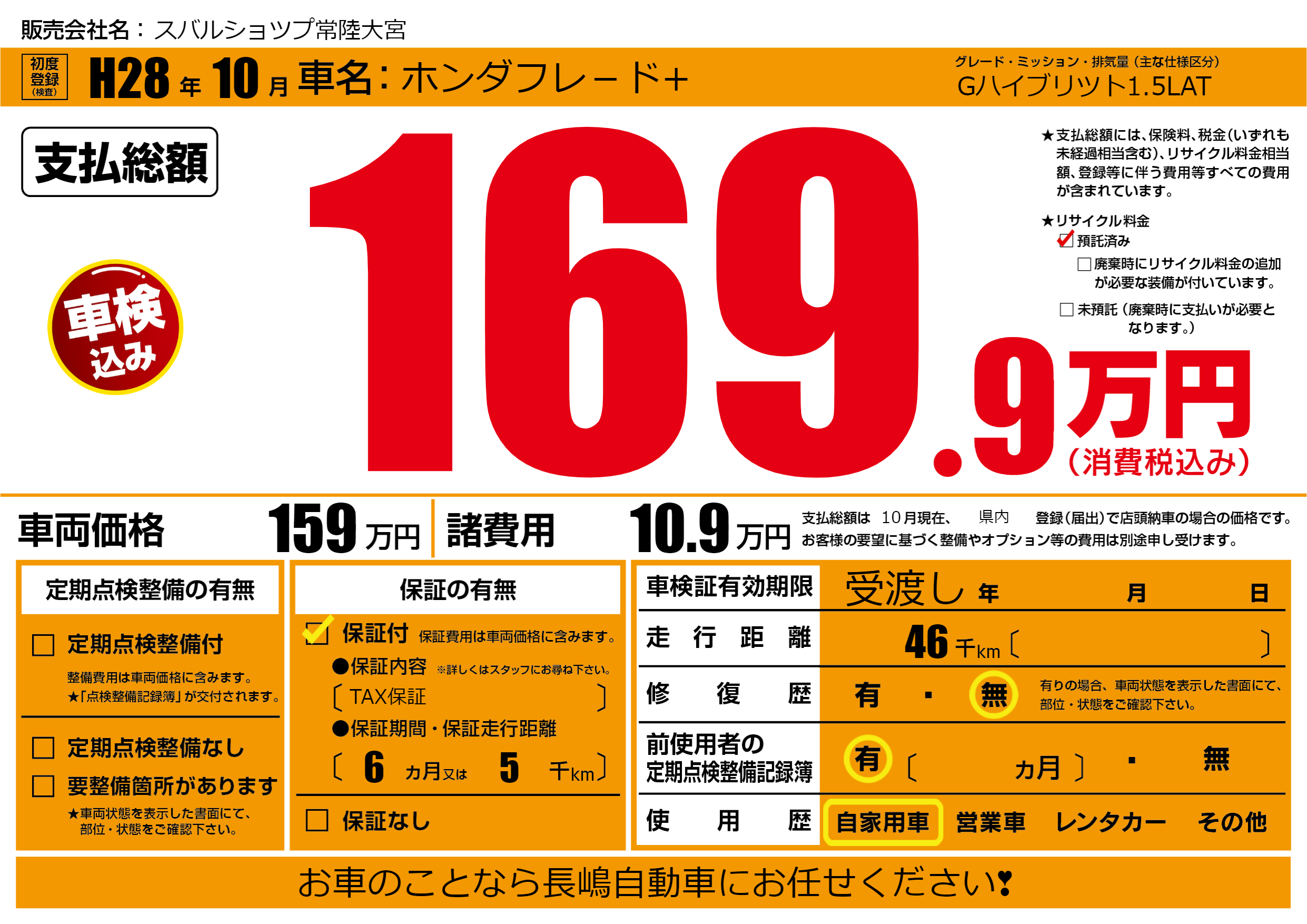 保証付き 保証内容(TAX保証) 6ヶ月または(5)千kmまで |