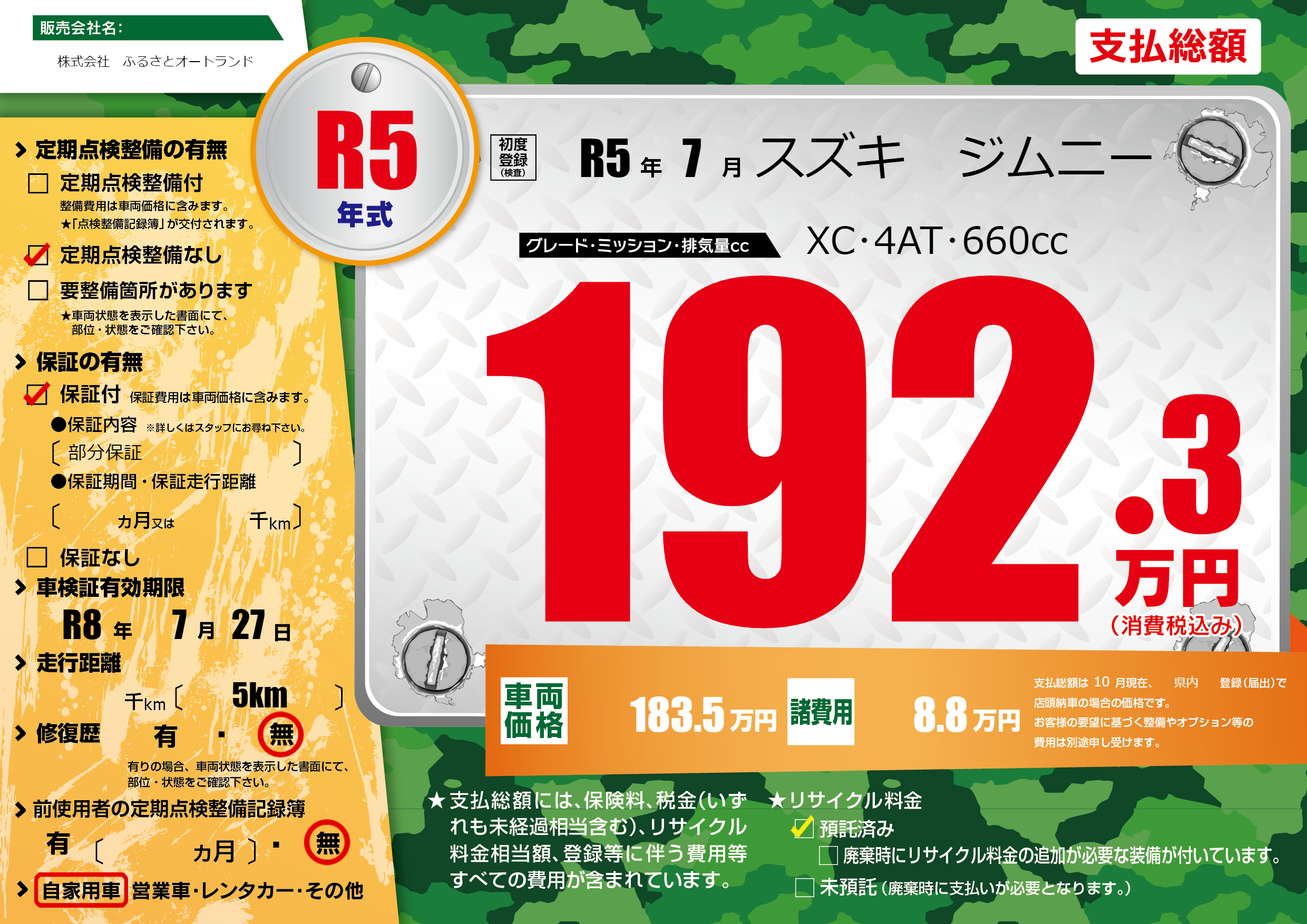 | 走行キロ | - | 初年度登録 | R5年7月 |