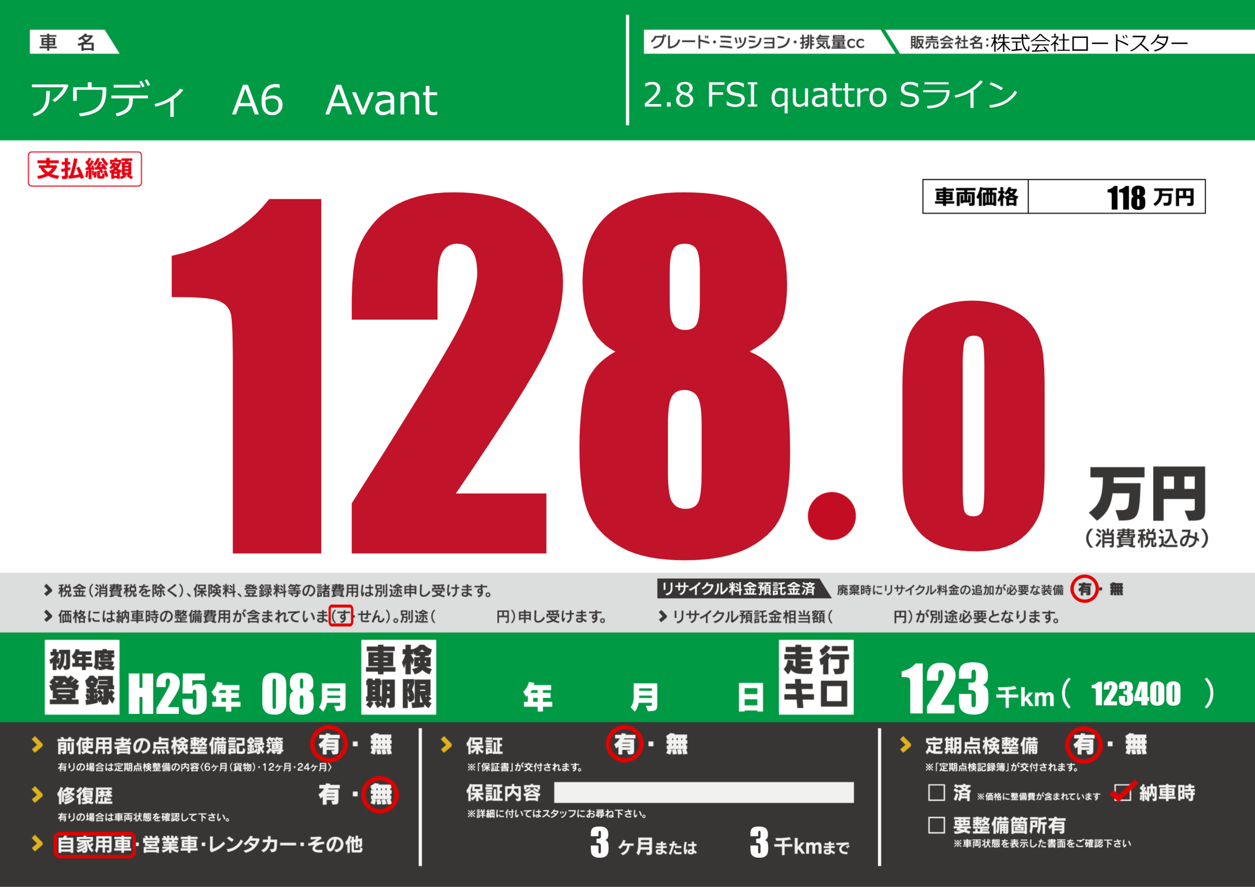 | 車名 | アウディ A6 Avant | グレード ミッション 排気量 |