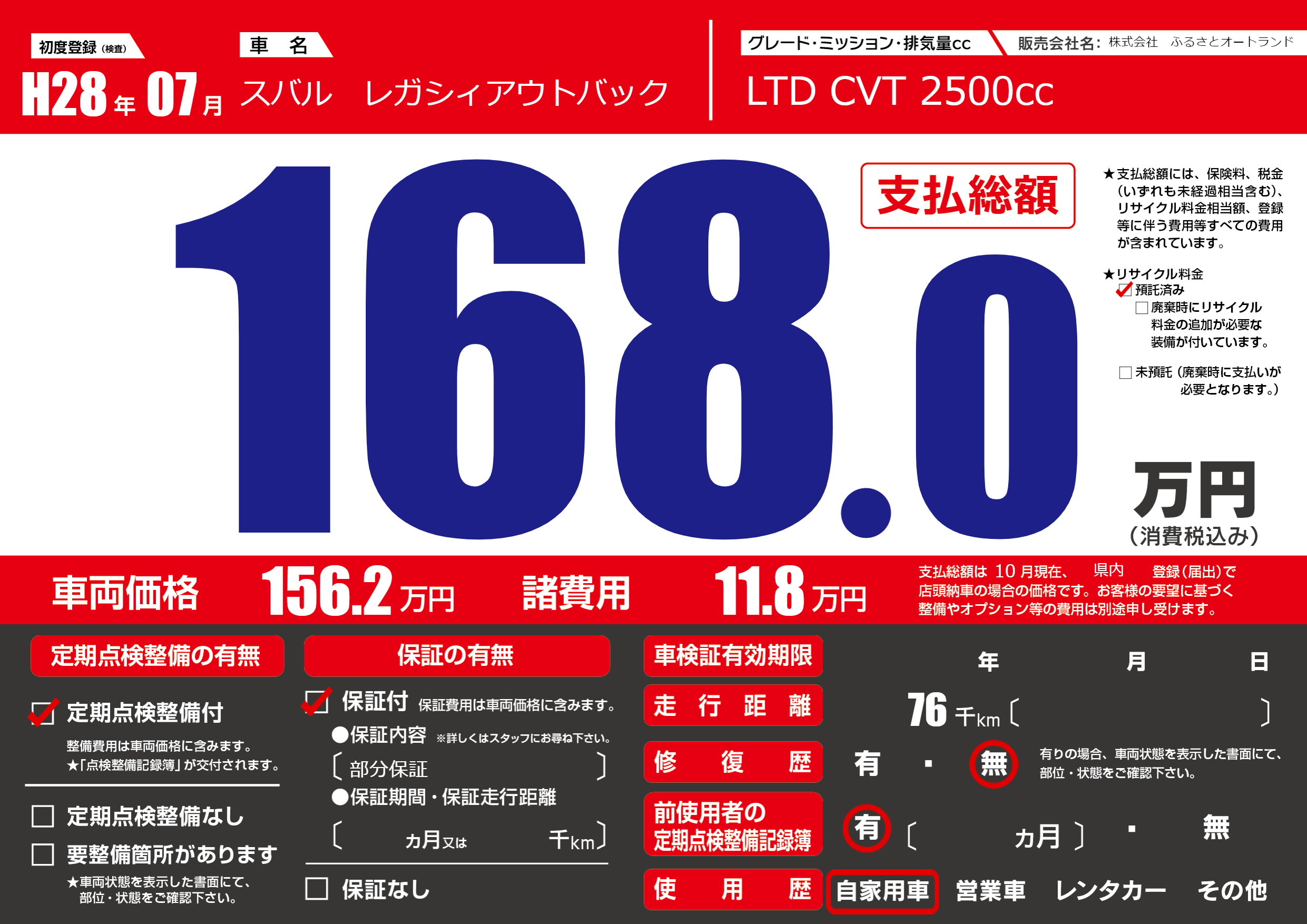 | 車名 | スバル レガシィアウトバック | グレード ミッション 排気量 |