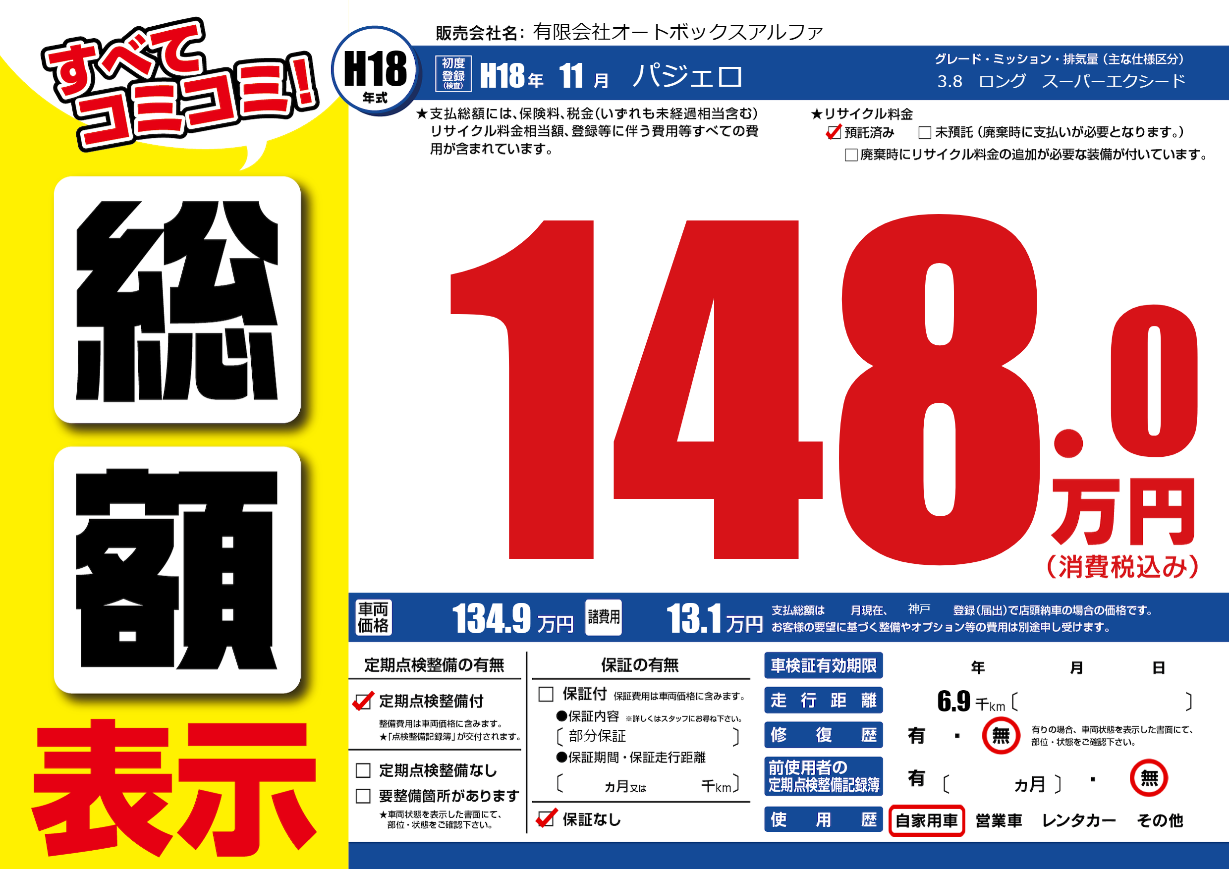 保証なし 保証内容(部分保証) ---ヶ月または()千kmまで |