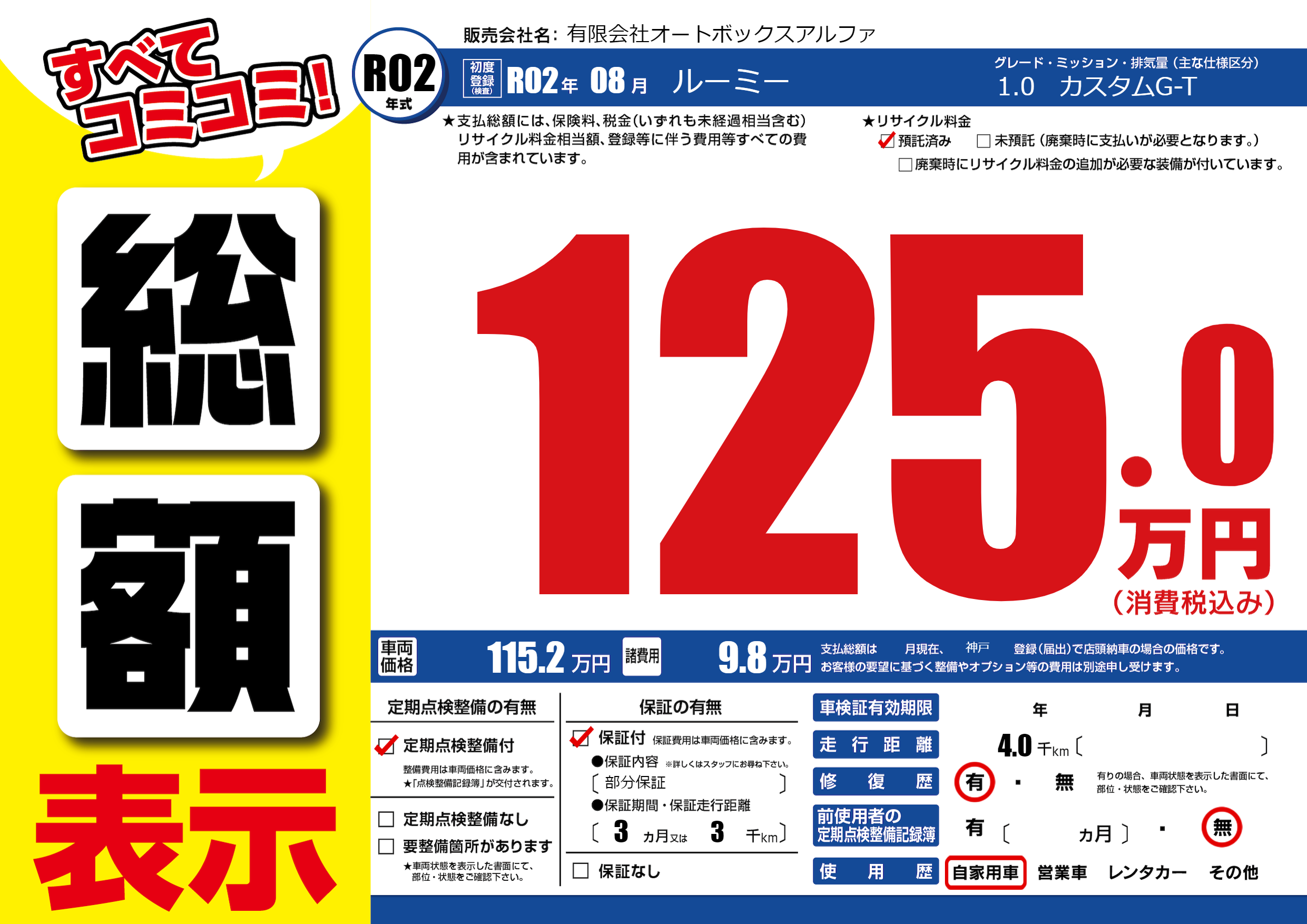 | 車名 | ルーミー | グレード ミッション 排気量 |