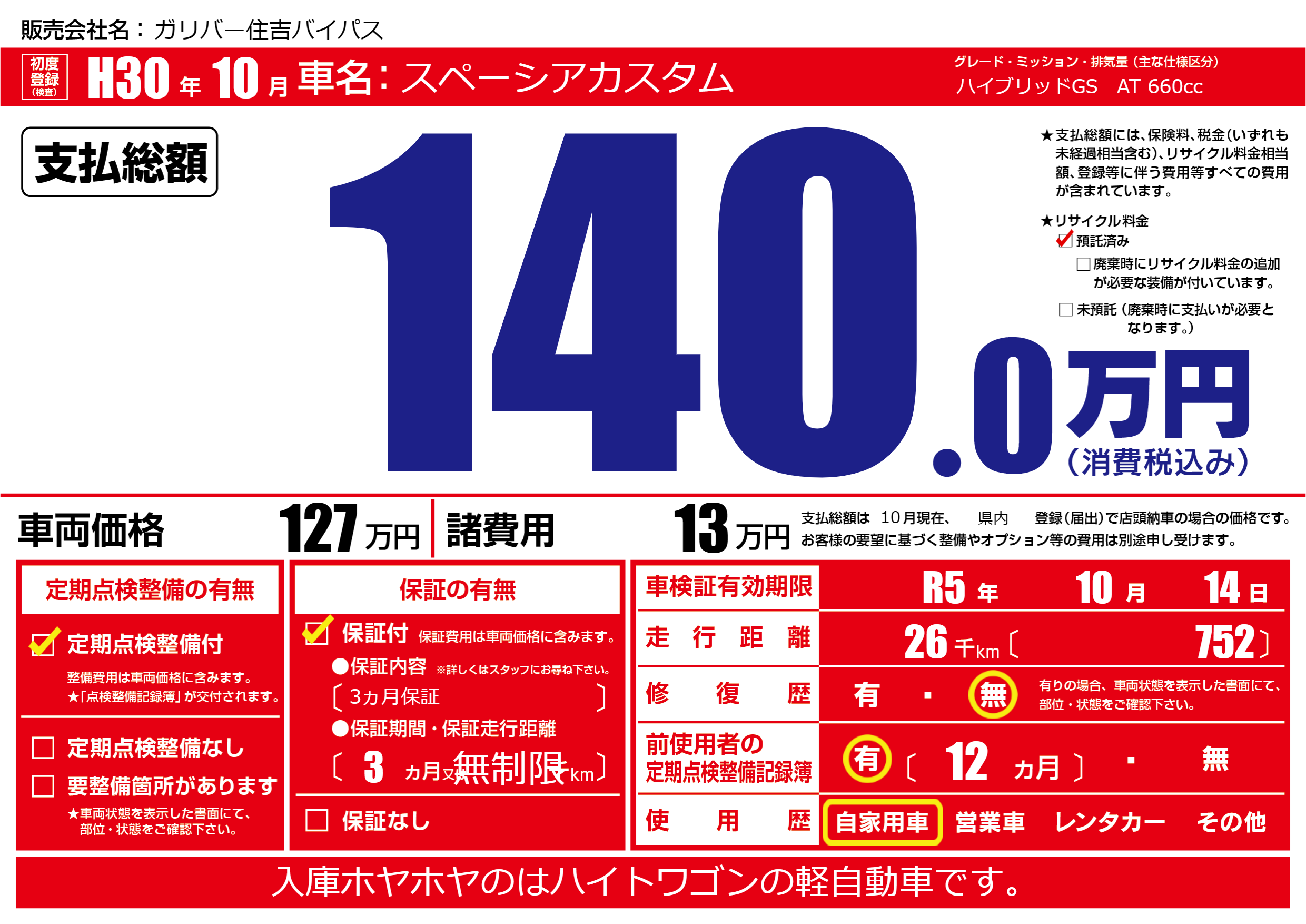 | 車検制限 | R5年 10月 14日 | ||