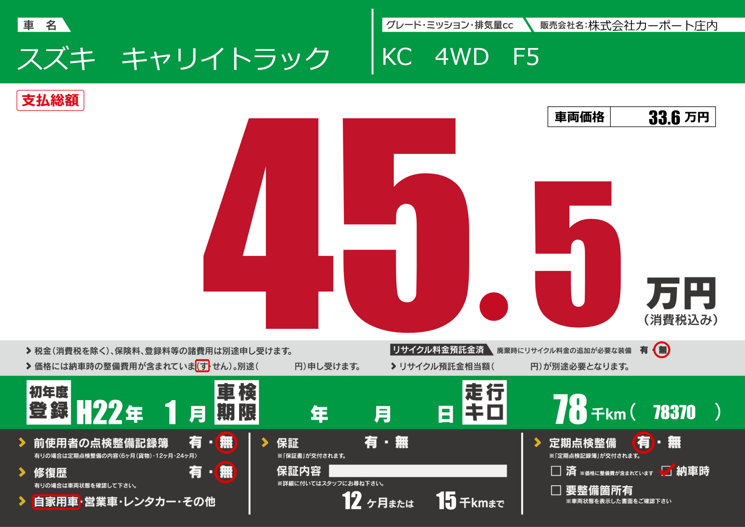 | 定期点検整備 | 定期点検整備あり 納車時あり | ||