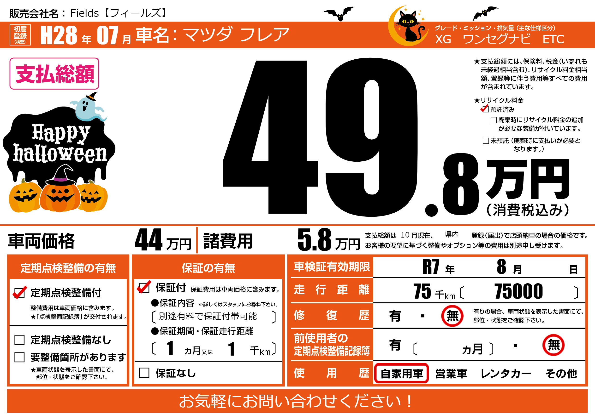 | 走行キロ | 7.5万km | 初年度登録 | H28年07月 |