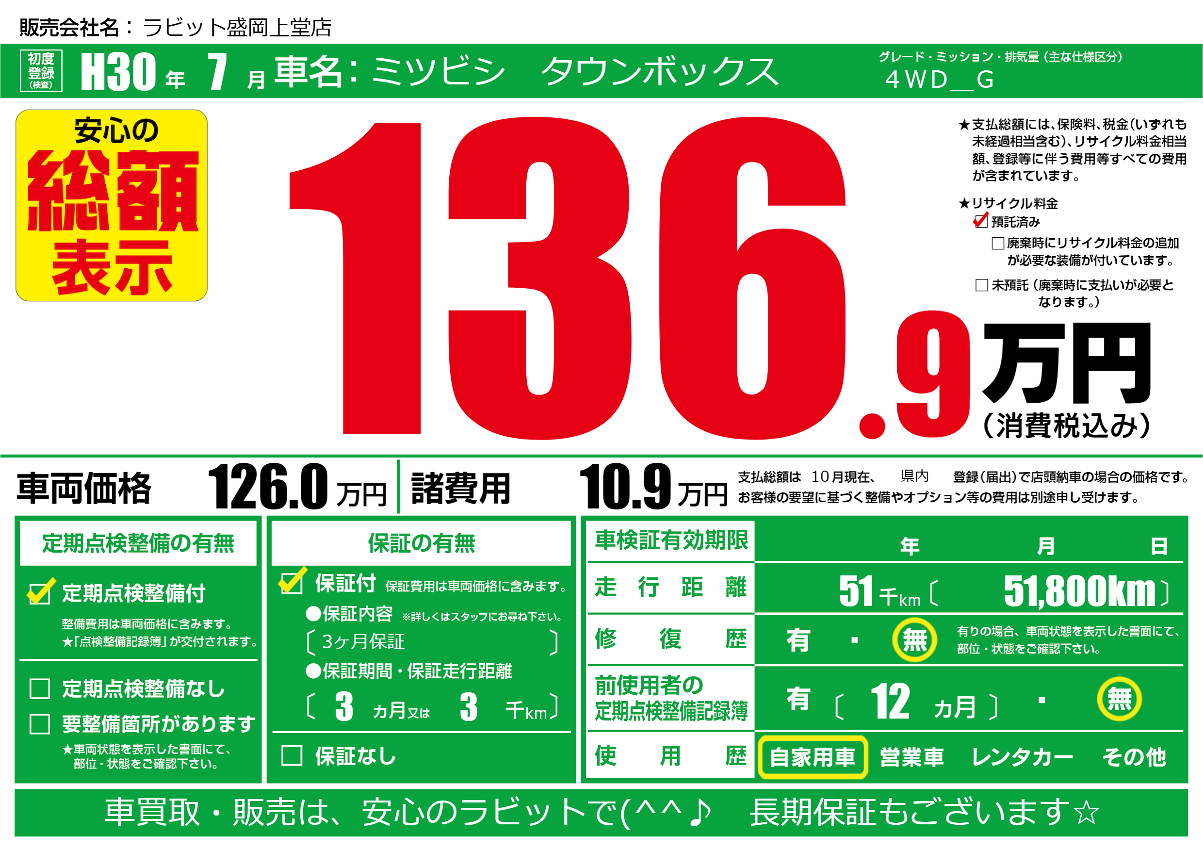 | 車名 | ミツビシ タウンボックス | グレード ミッション 排気量 |