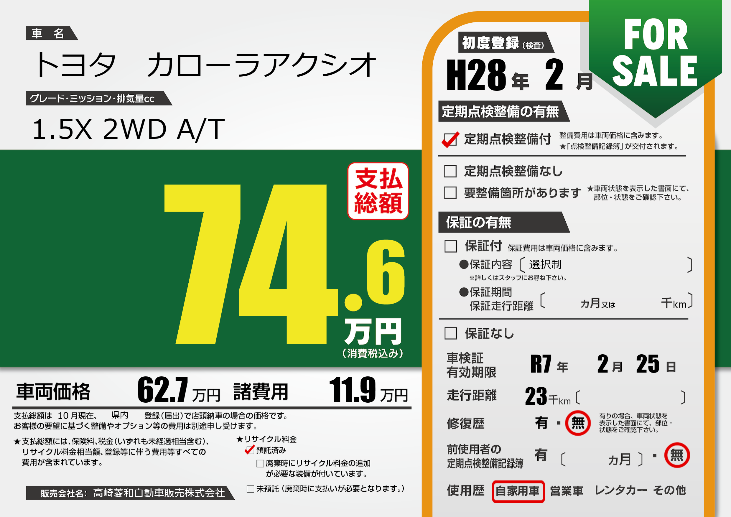 保証なし 保証内容(選択制) ---ヶ月または()千kmまで |