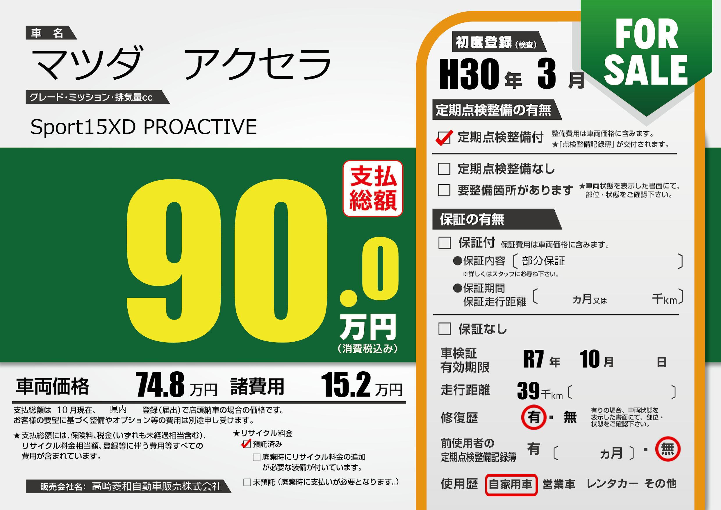 保証なし 保証内容(部分保証) ---ヶ月または()千kmまで |