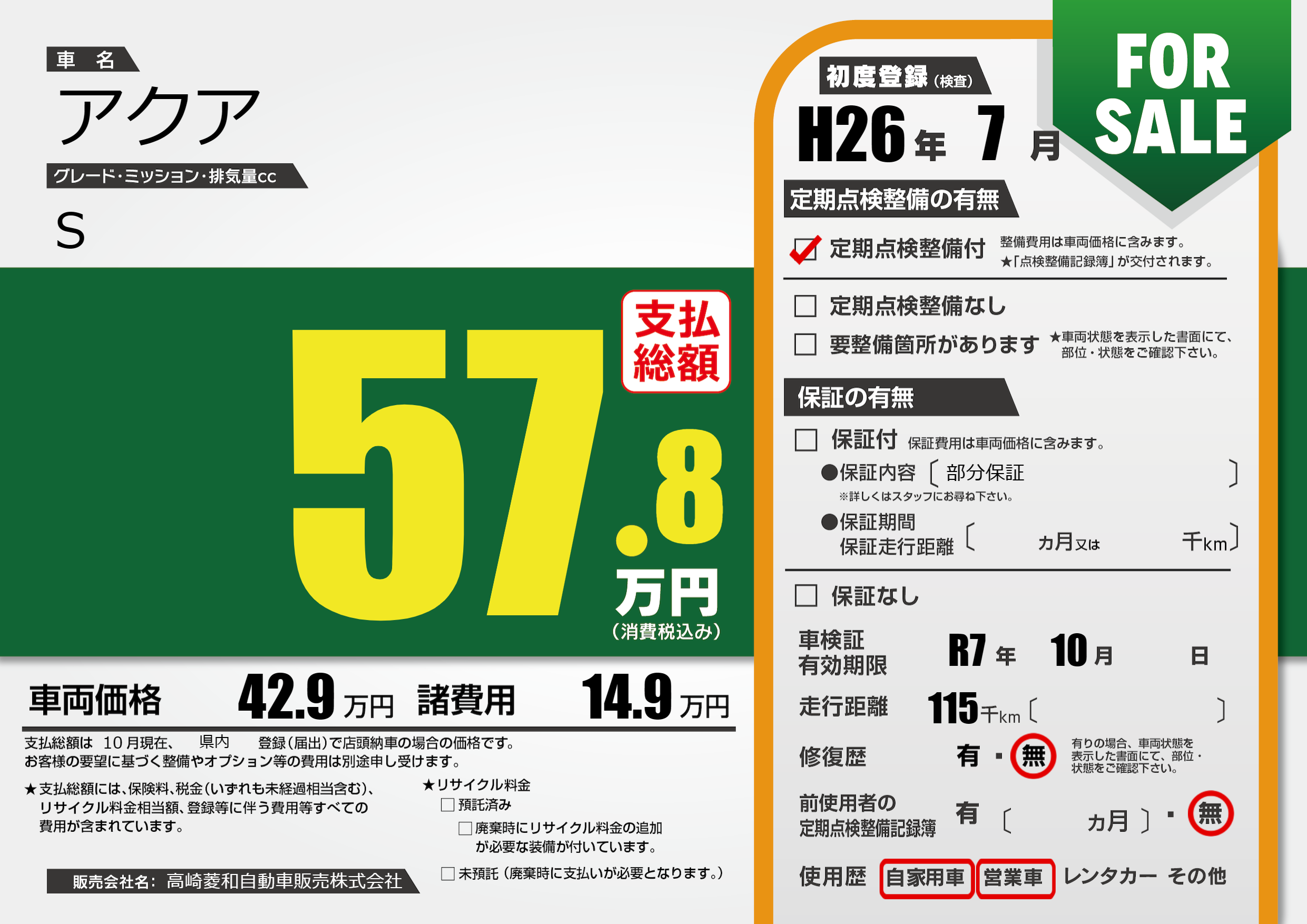 | 走行キロ | 11.5万km | 初年度登録 | H26年7月 |