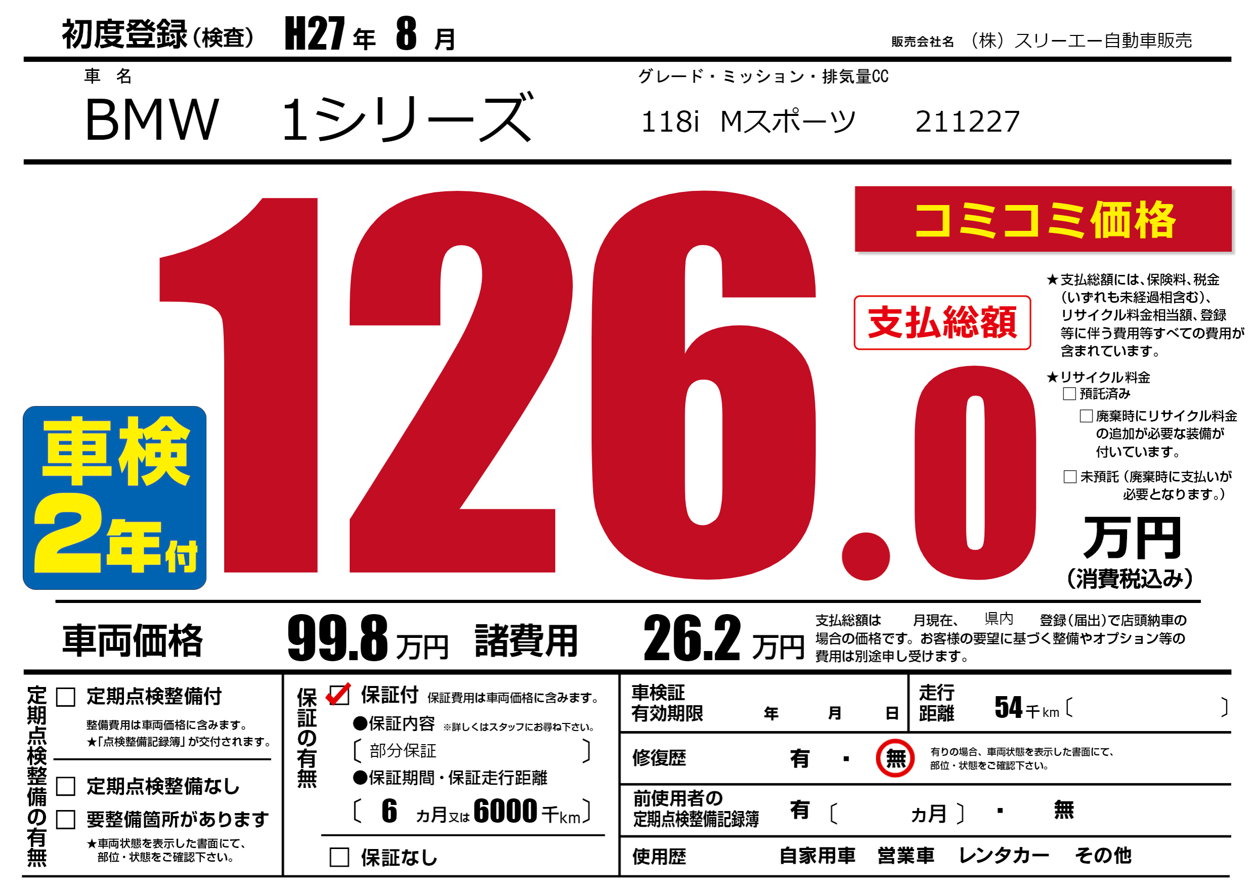 保証付き 保証内容(部分保証) 6ヶ月または(6000)千kmまで |