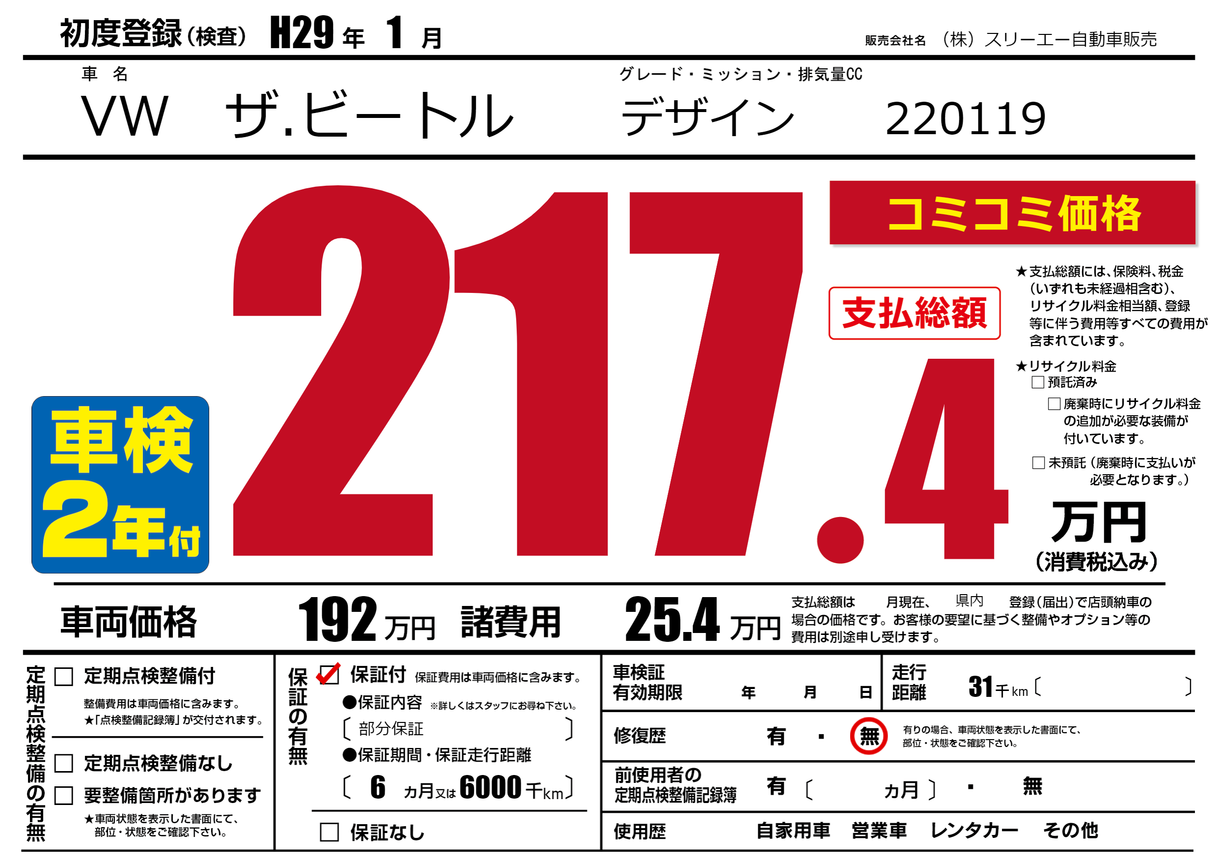 | 車名 | VW ザ.ビートル | グレード ミッション 排気量 |