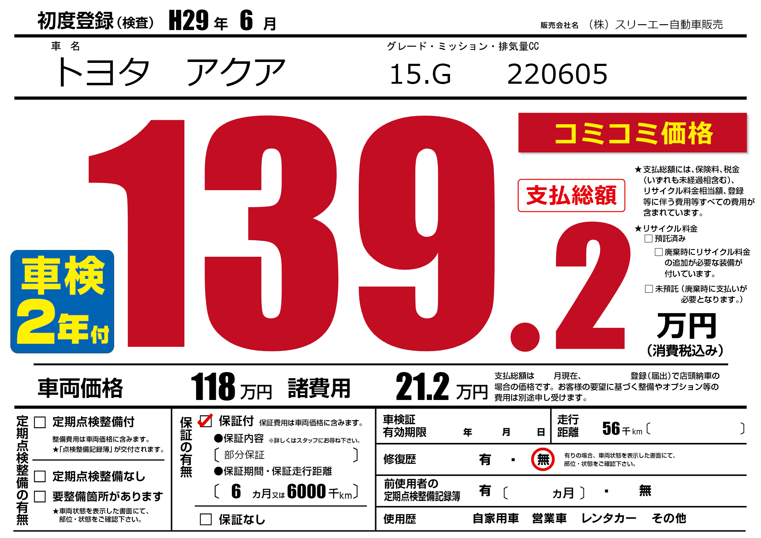 保証付き 保証内容(部分保証) 6ヶ月または(6000)千kmまで |