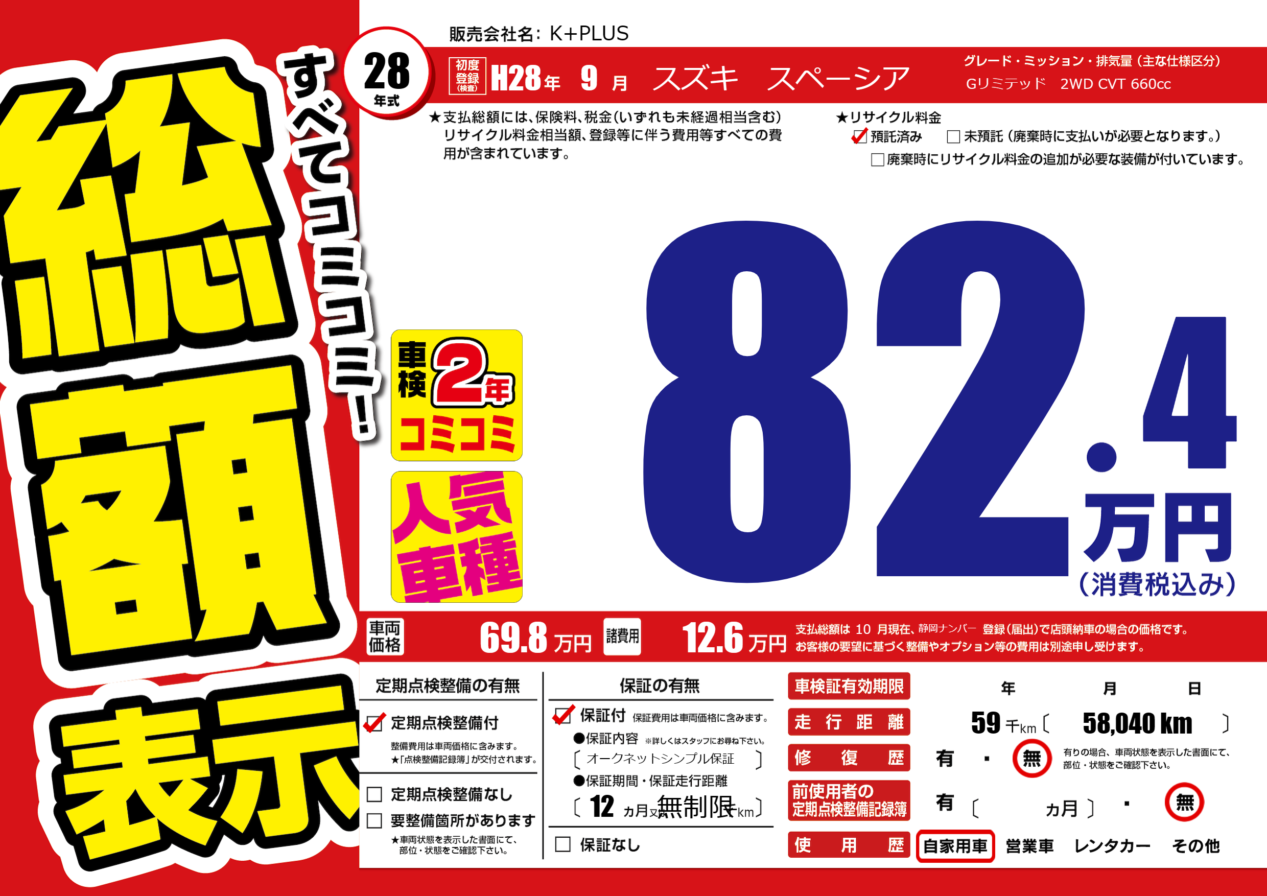 | 走行キロ | 5.9万km | 初年度登録 | H28年9月 |