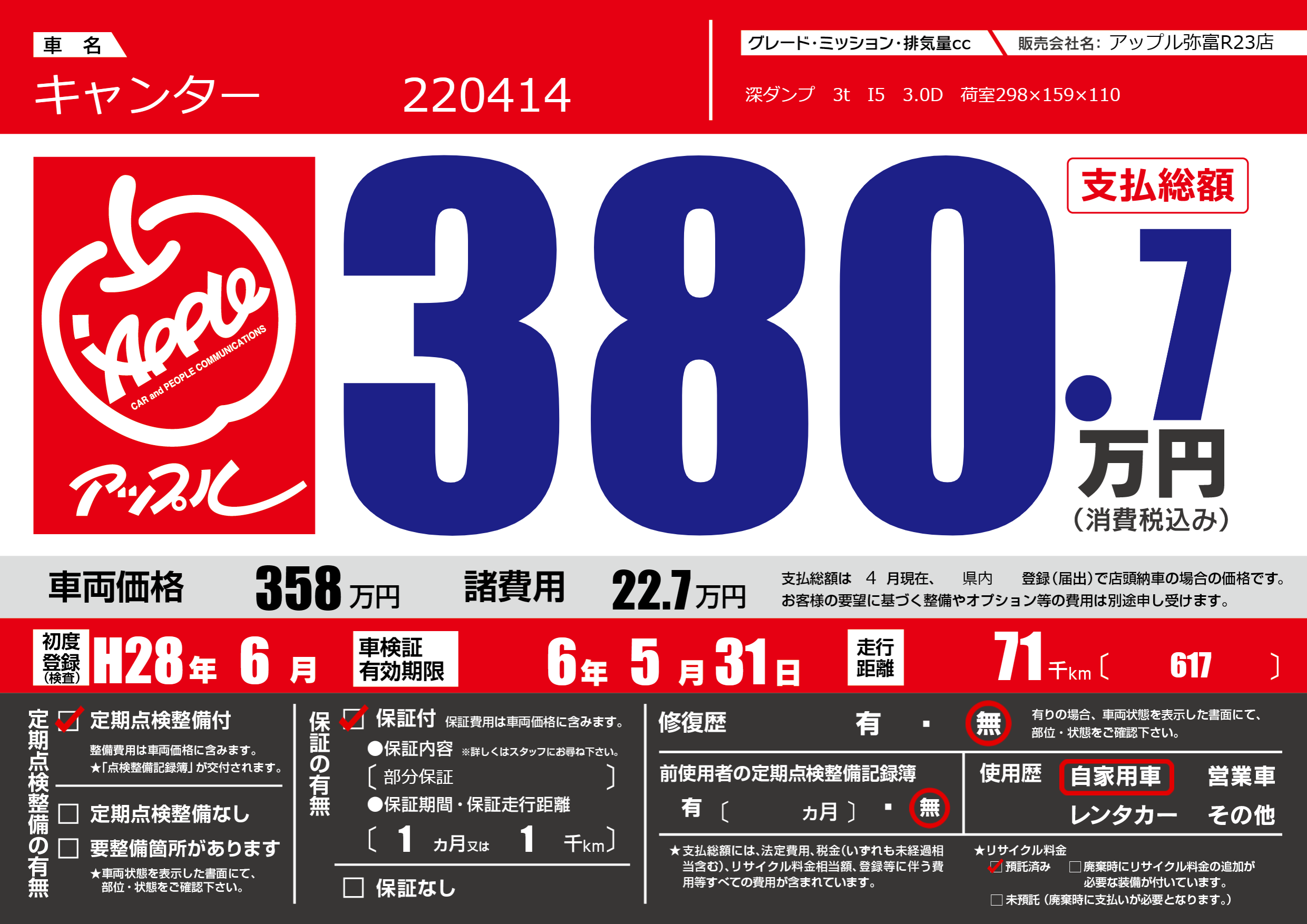 | 車名 | キャンター 220414 | グレード ミッション 排気量 |