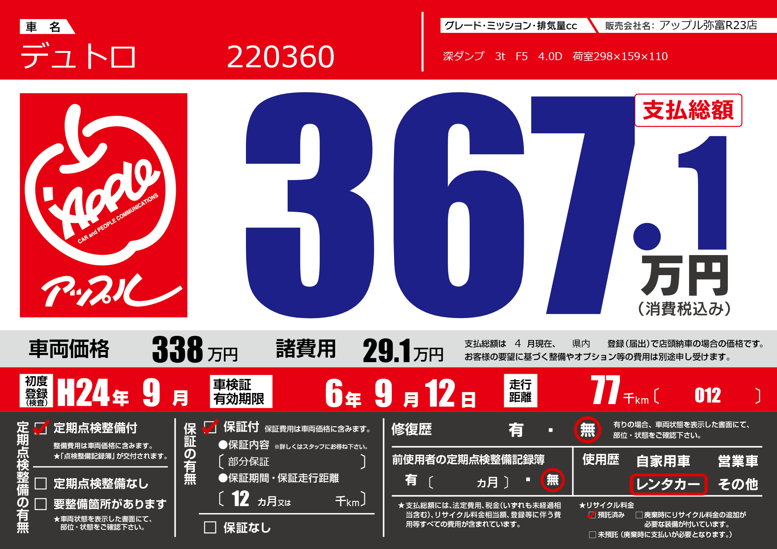 | 車名 | デュトロ 220360 | グレード ミッション 排気量 |