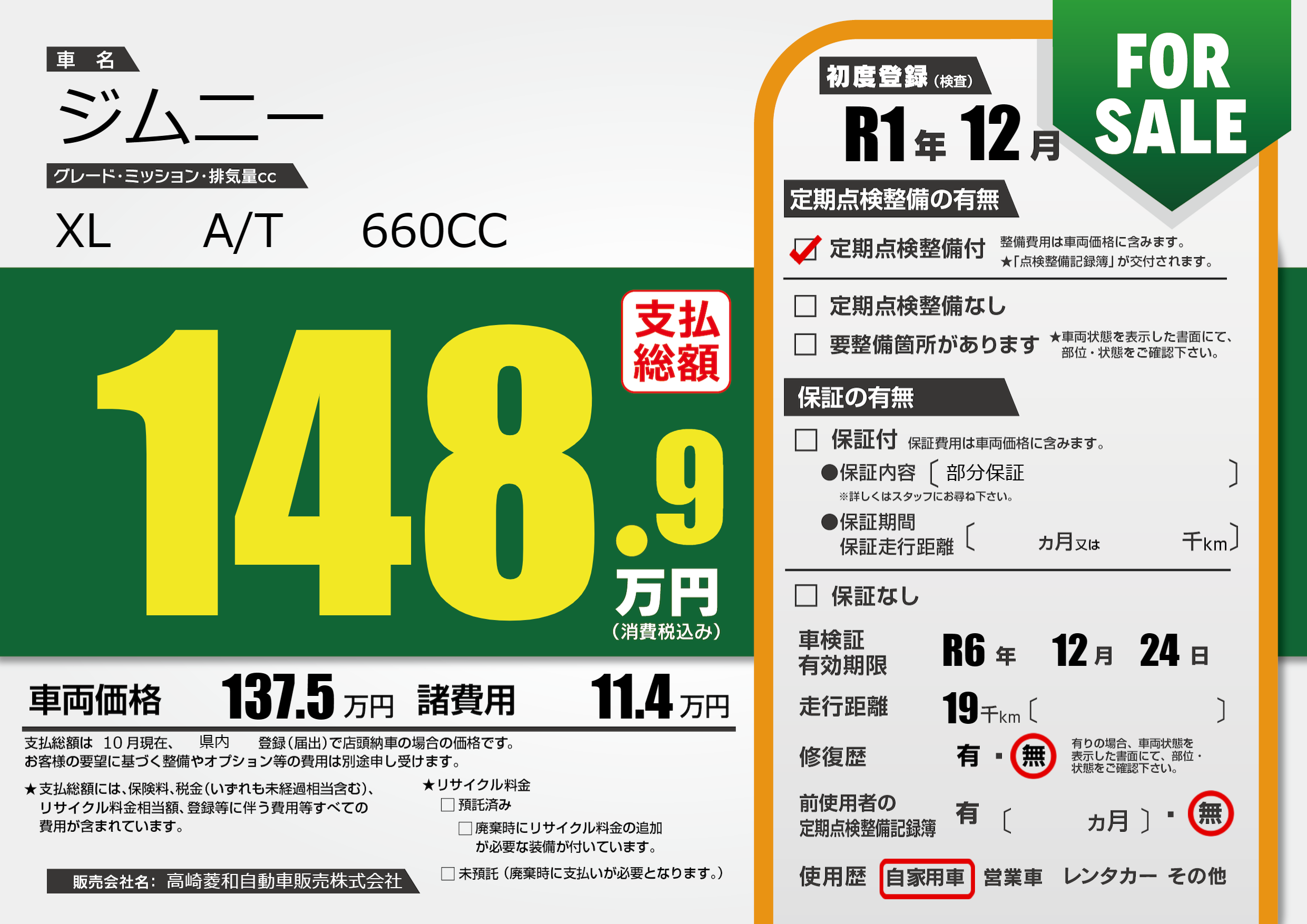 | 車名 | ジムニー | グレード ミッション 排気量 |