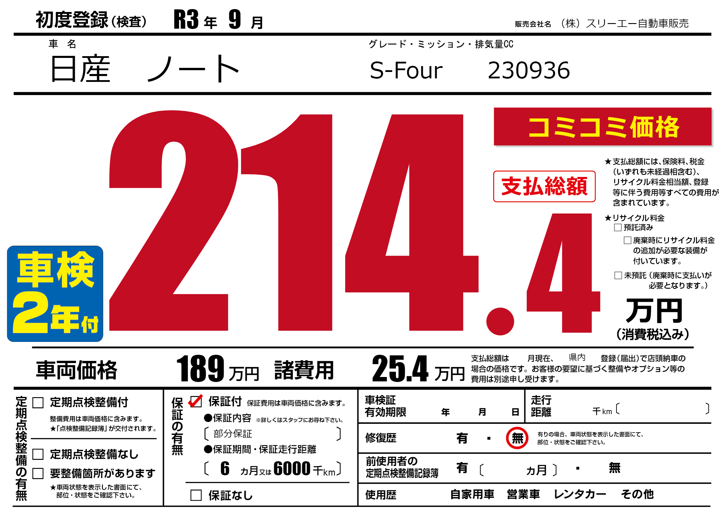 保証付き 保証内容(部分保証) 6ヶ月または(6000)千kmまで |
