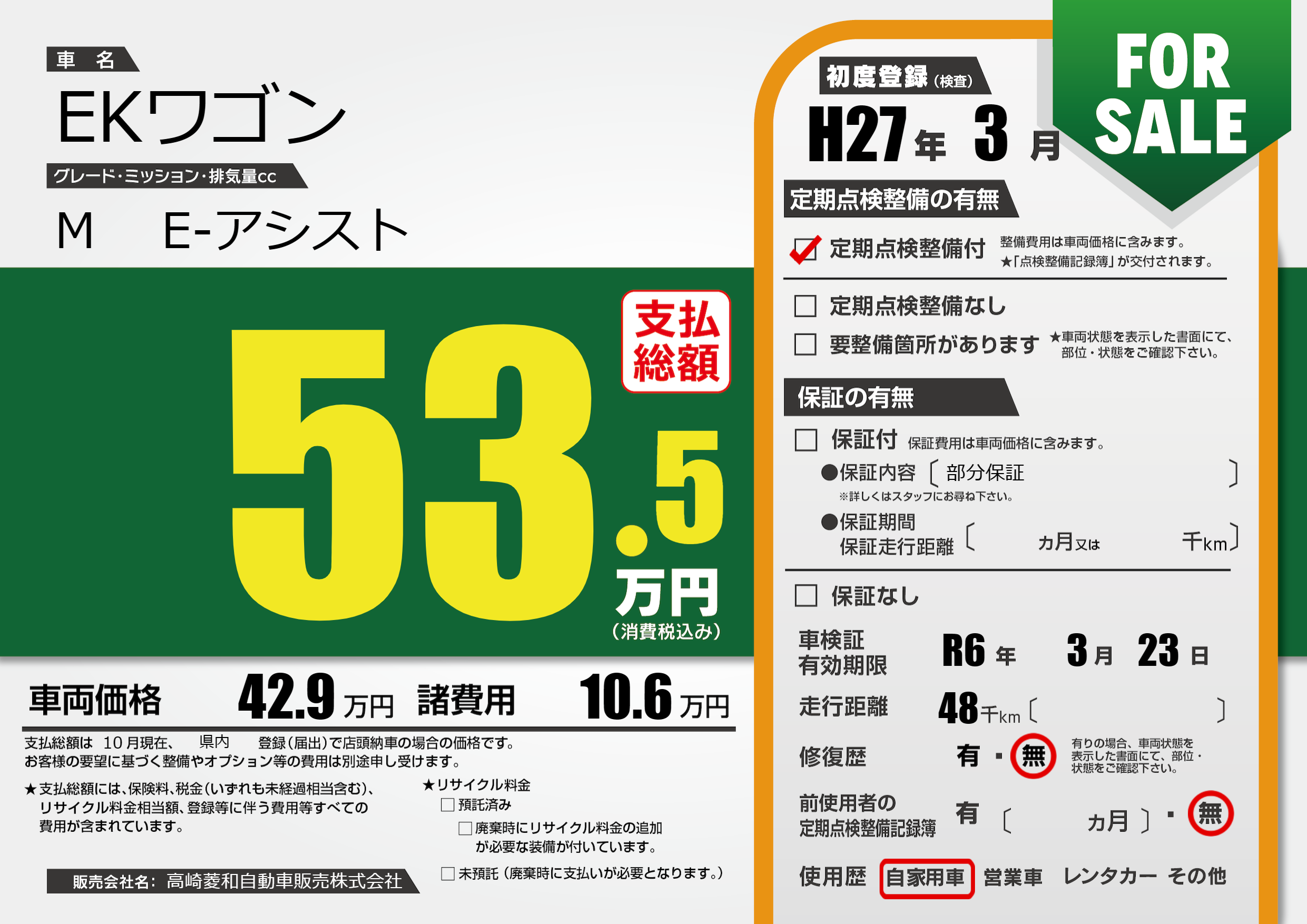 | 車名 | EKワゴン | グレード ミッション 排気量 |