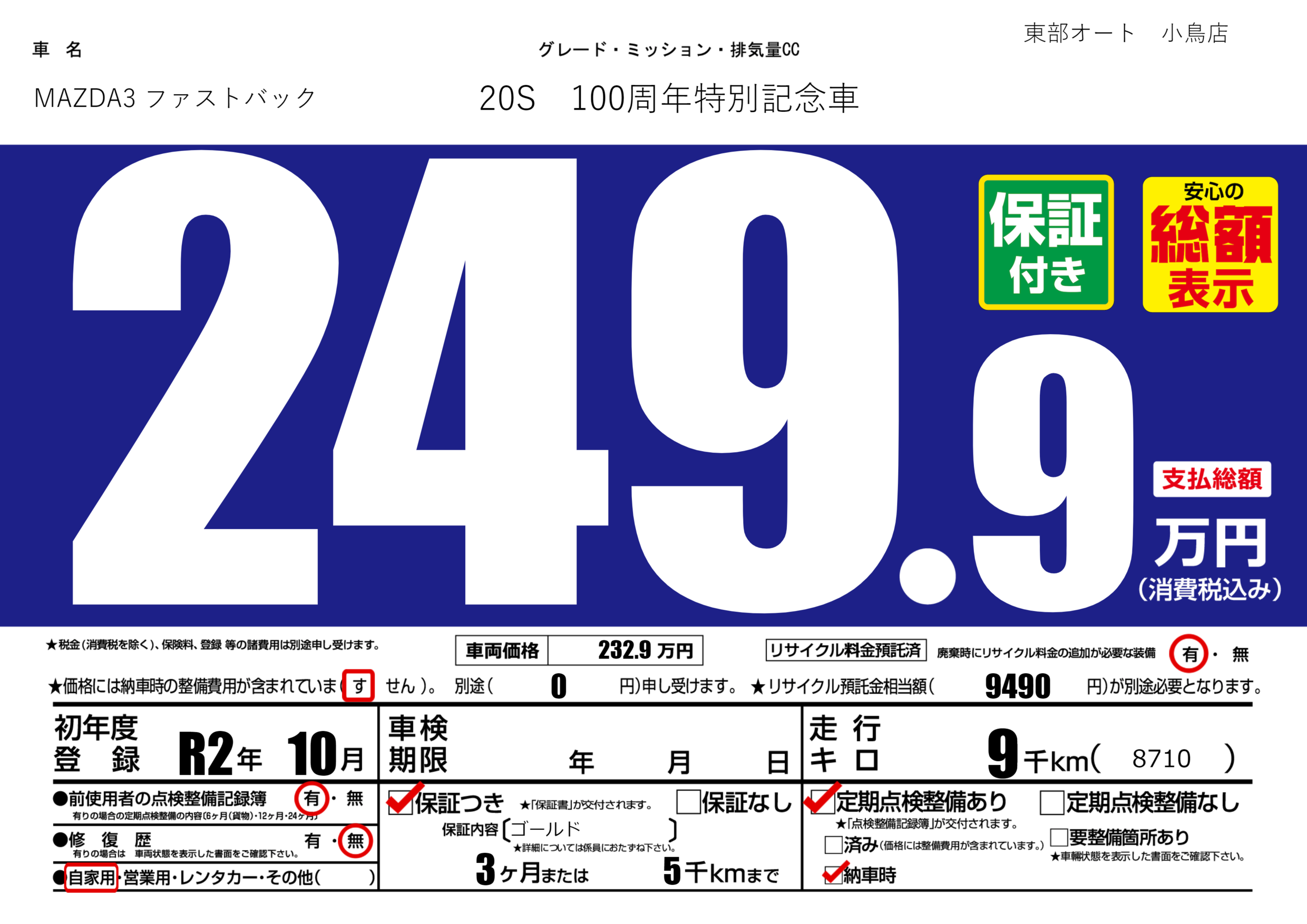 | 車名 | MAZDA3 ファストバック | グレード ミッション 排気量 |