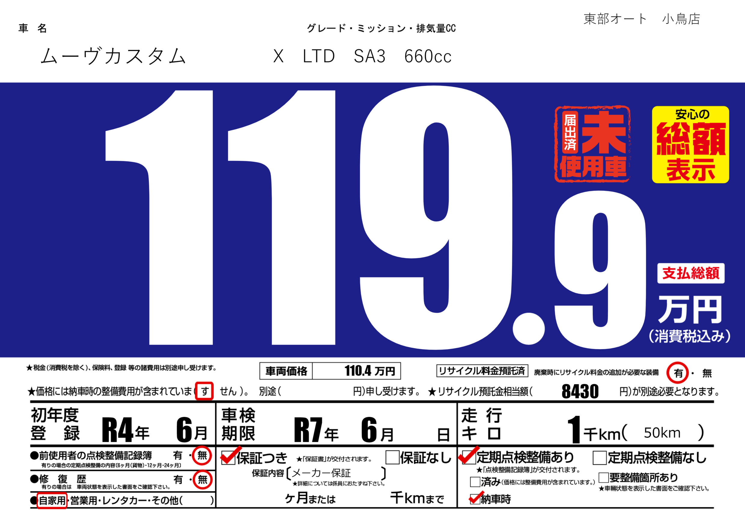 | 走行キロ | 0.1万km | 初年度登録 | R4年6月 |