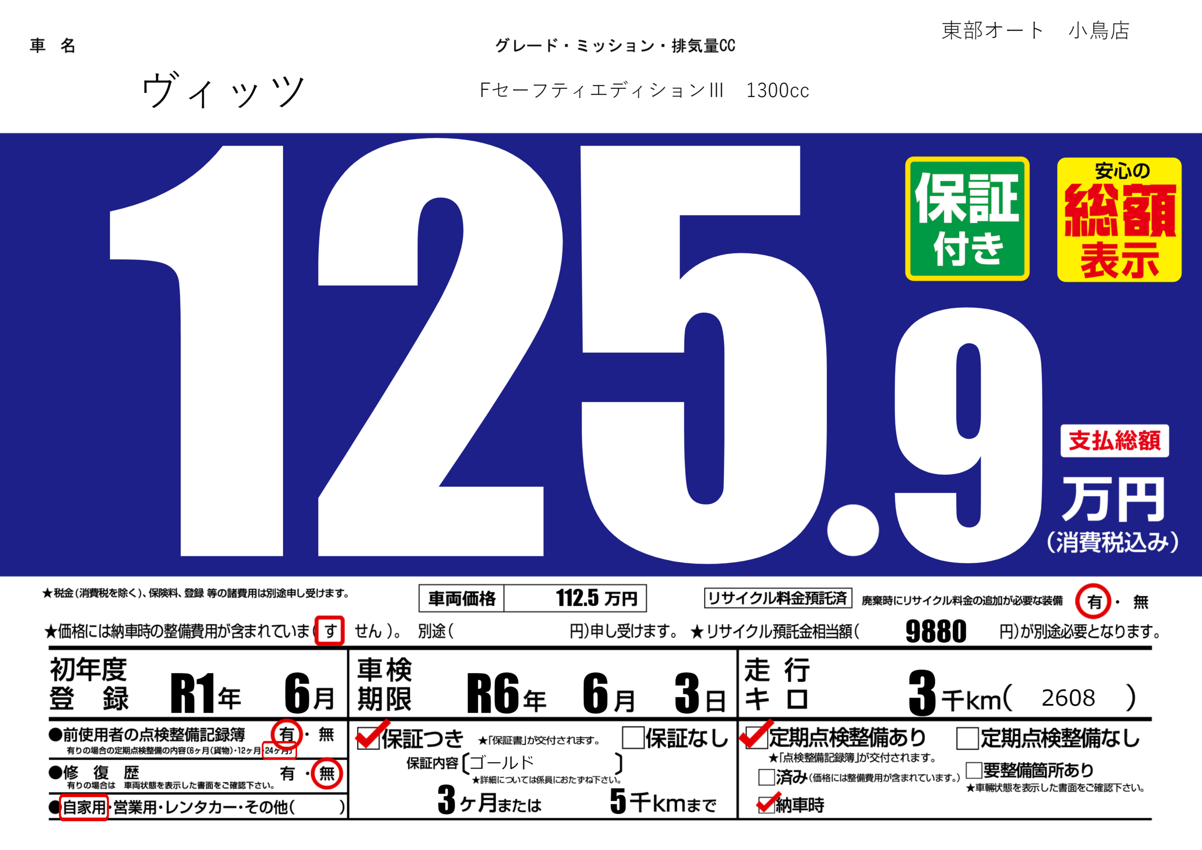 | 車名 | ヴィッツ | グレード ミッション 排気量 |