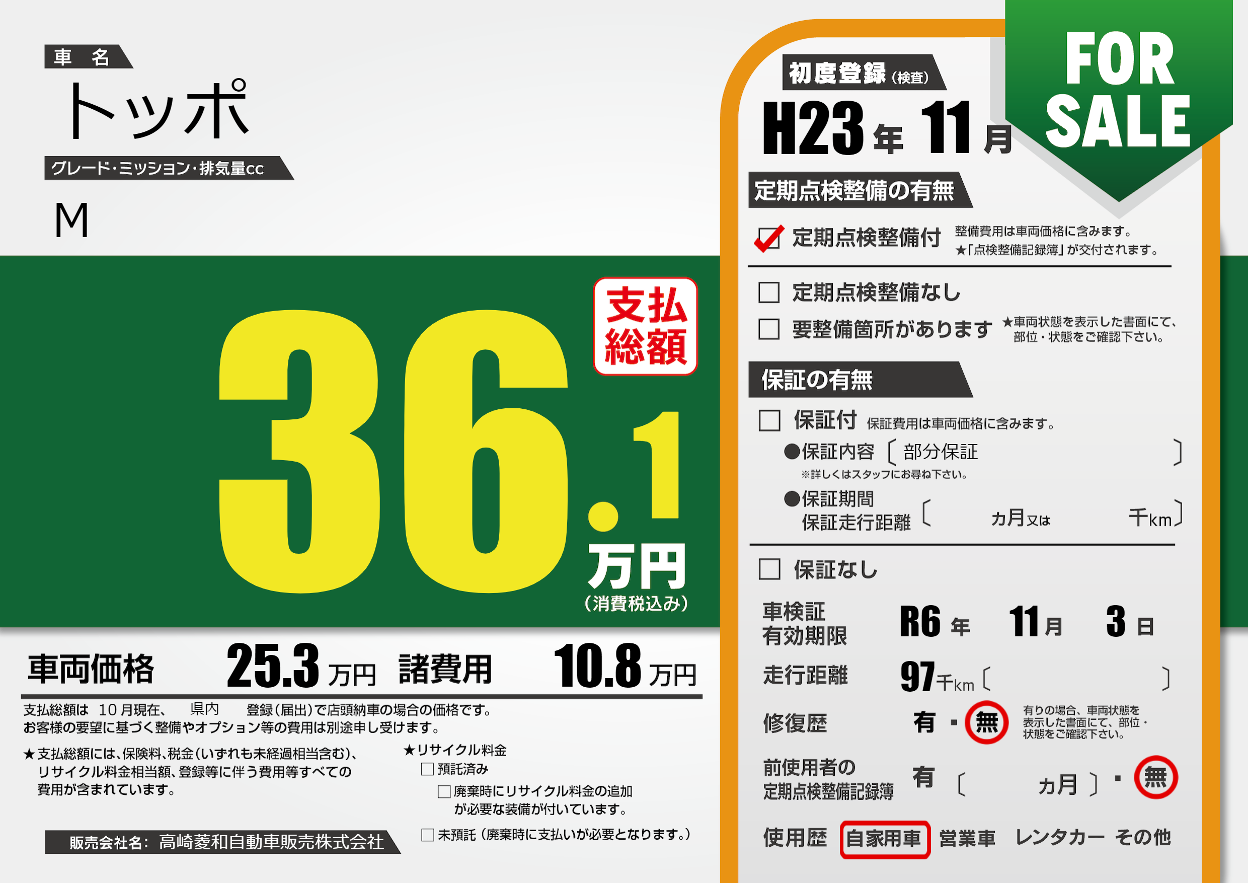 | 車名 | トッポ | グレード ミッション 排気量 |