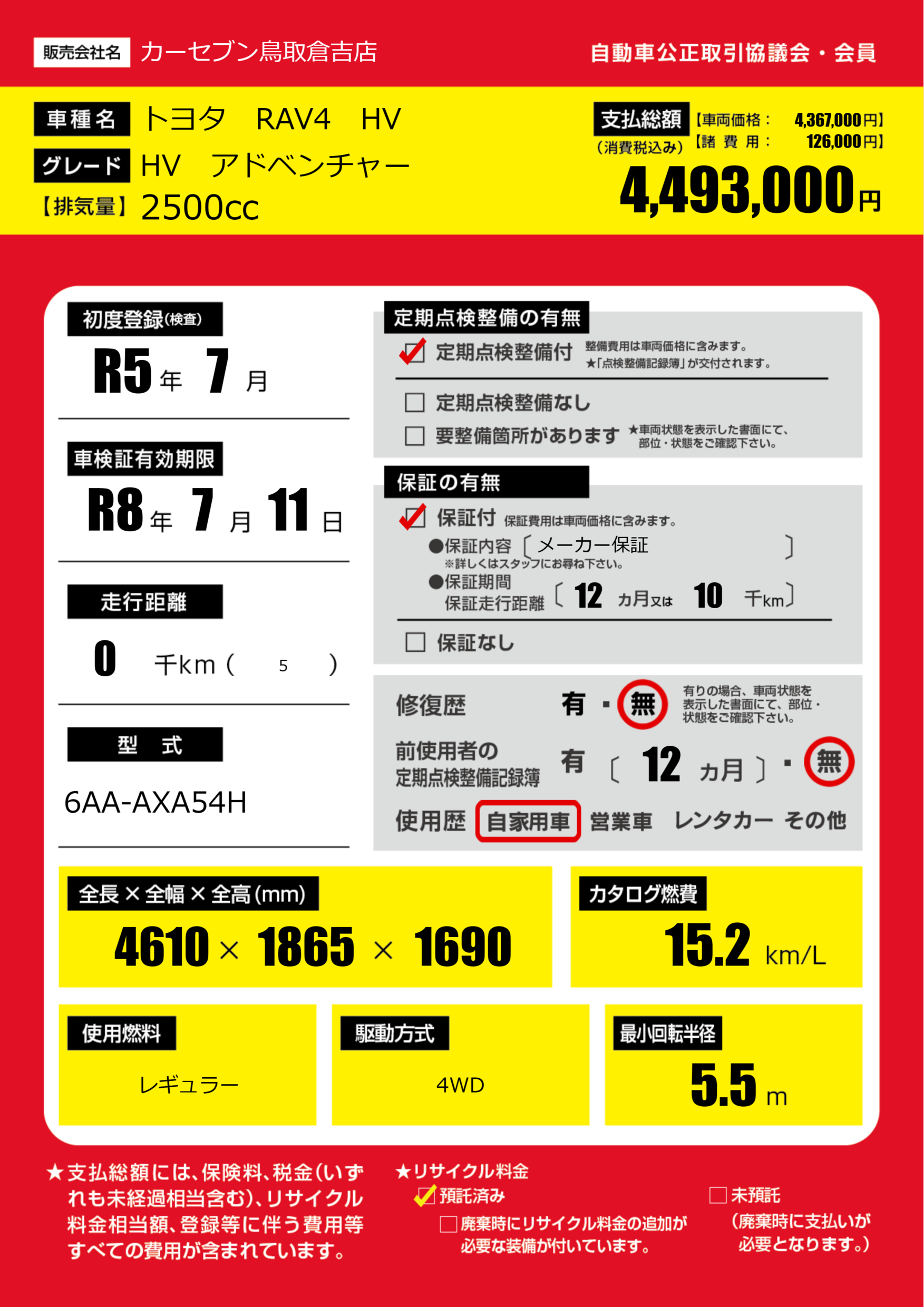 | 車名 | トヨタ RAV4 HV | グレード ミッション 排気量 |