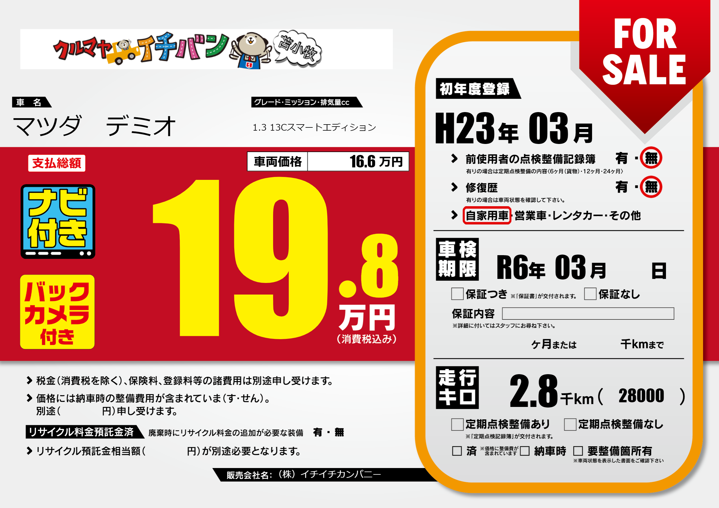 | 走行キロ | 0.2万km | 初年度登録 | H23年03月 |