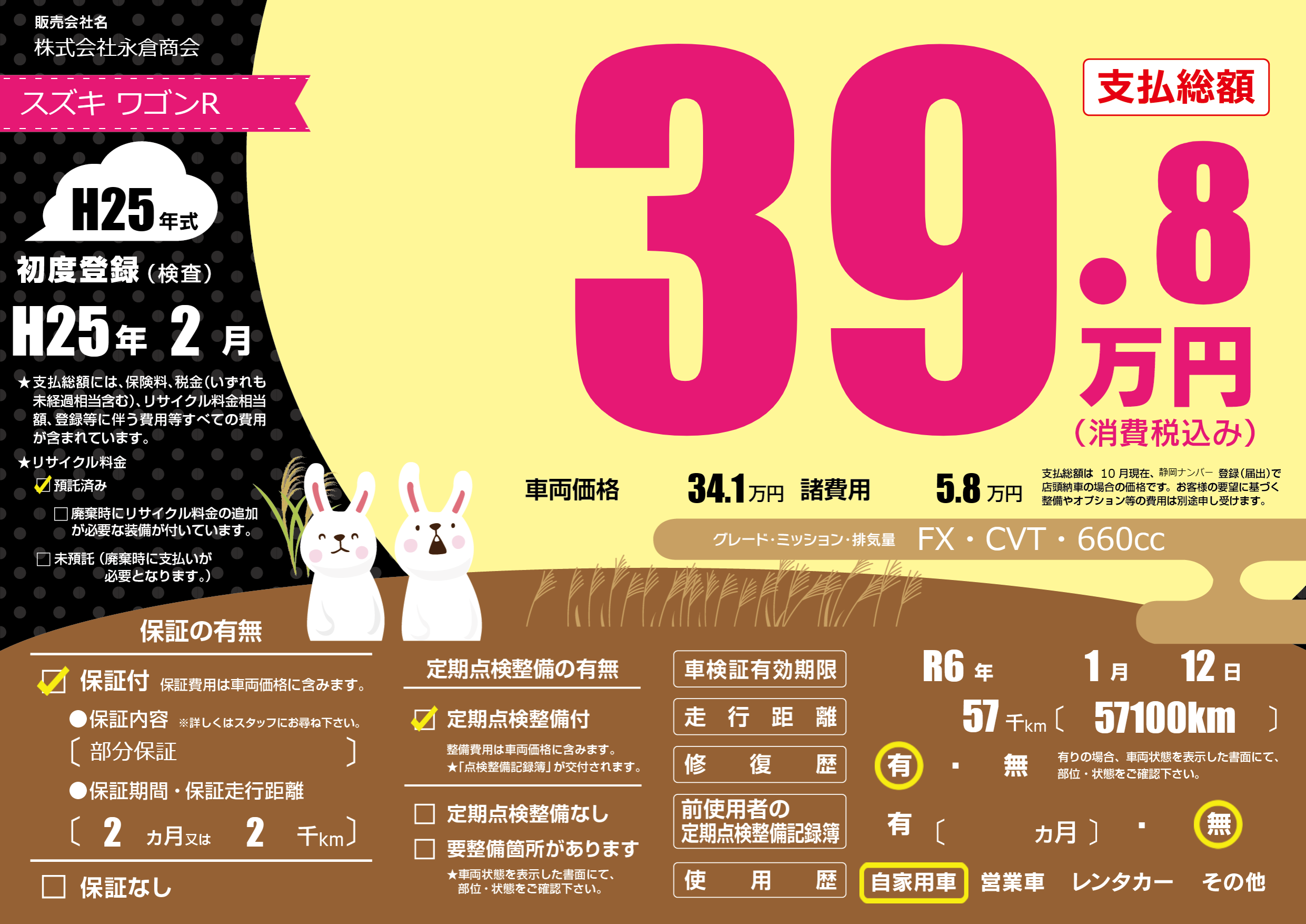 | 車名 | スズキ ワゴンR | グレード ミッション 排気量 |