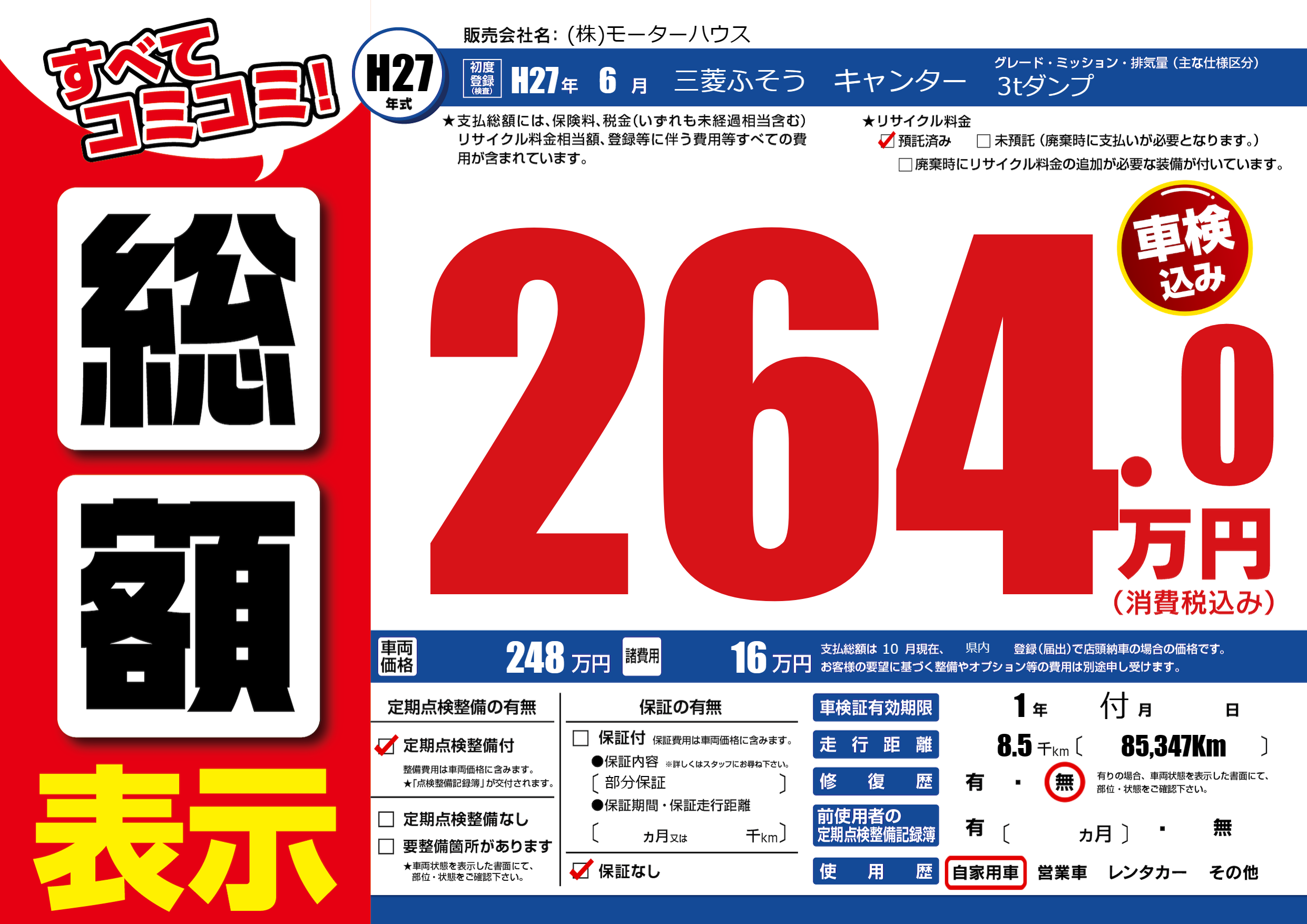 | 車名 | 三菱ふそう キャンター | グレード ミッション 排気量 |