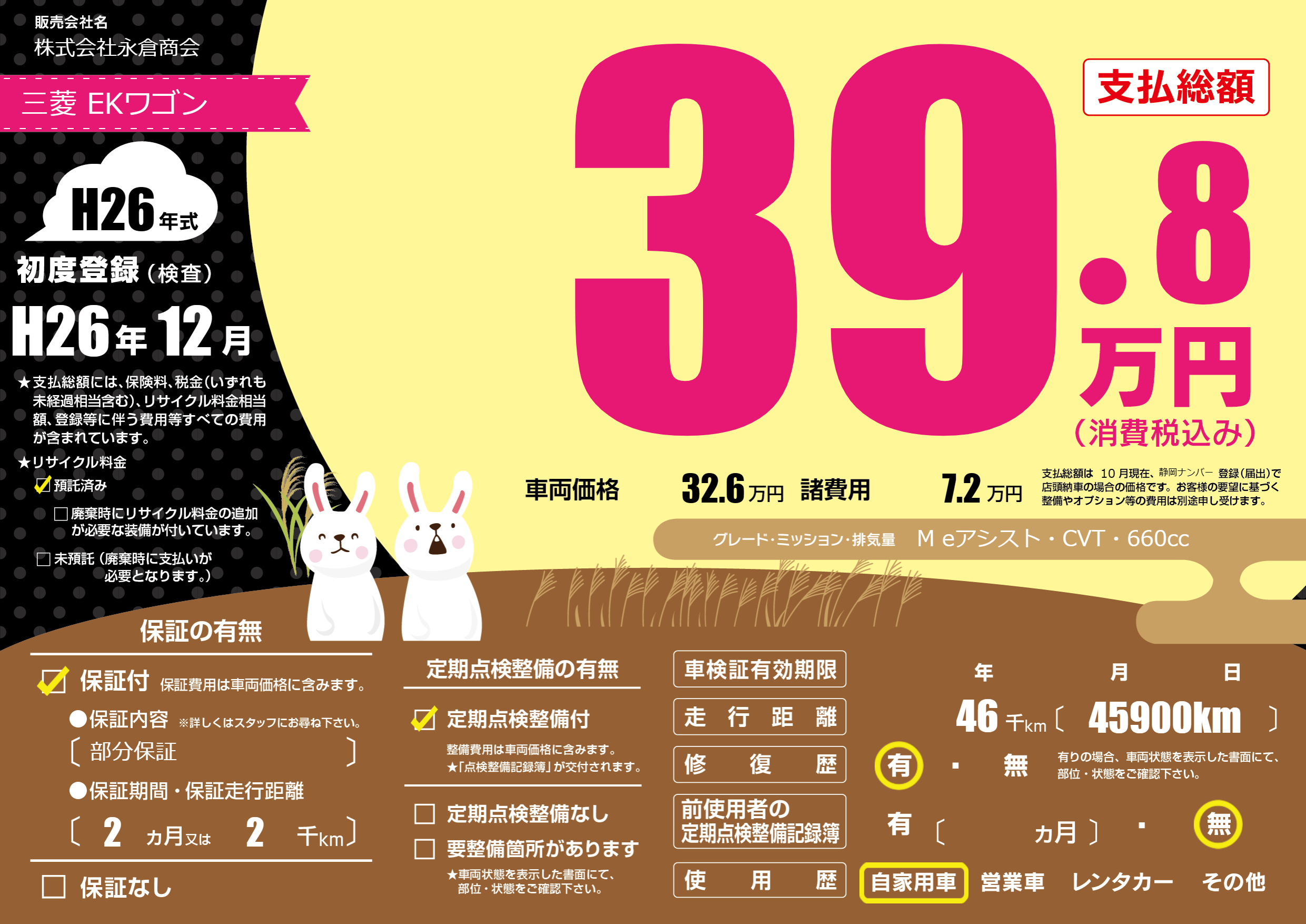 | 車名 | 三菱 EKワゴン | グレード ミッション 排気量 |