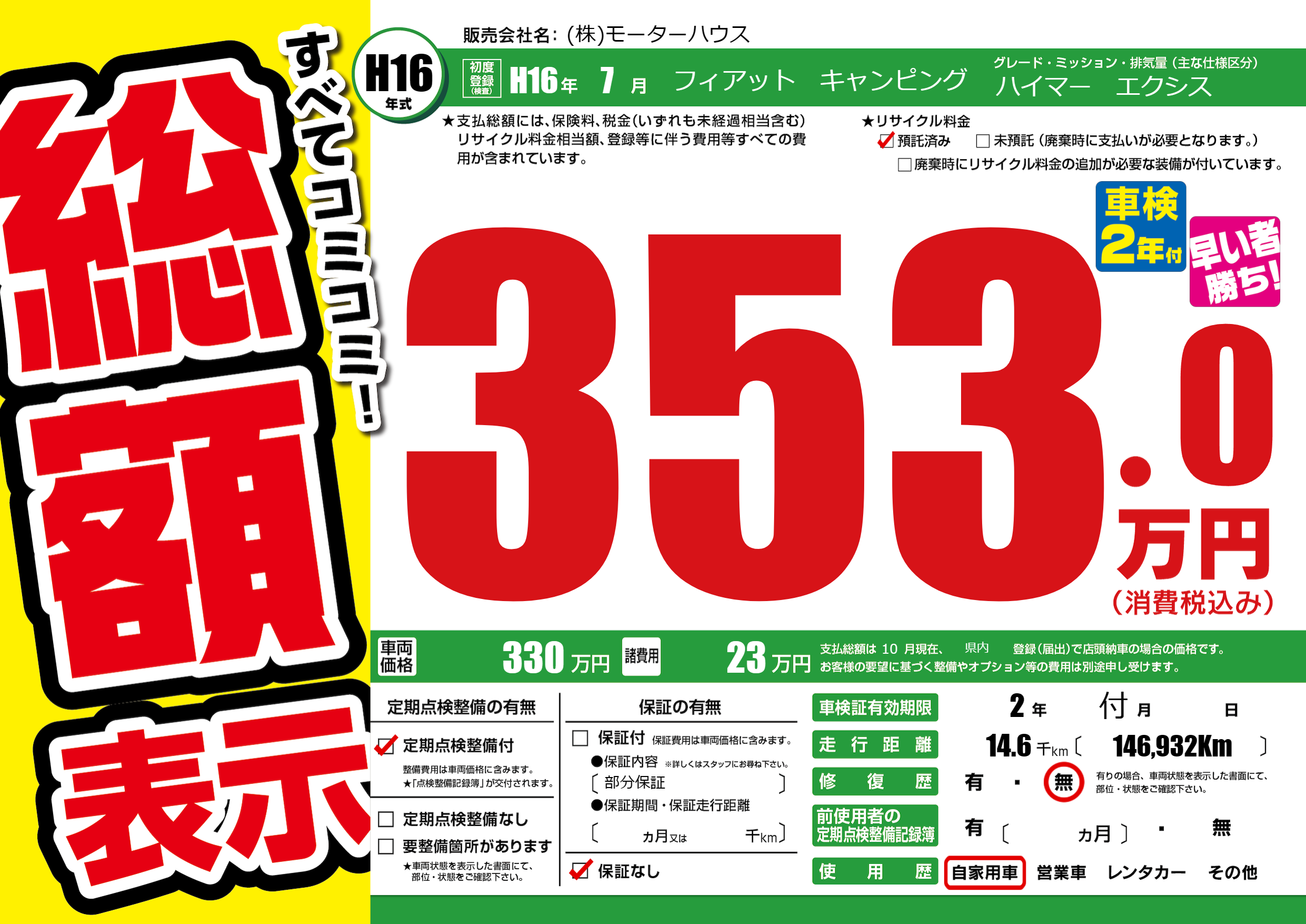 | 車名 | フィアット キャンピング | グレード ミッション 排気量 |