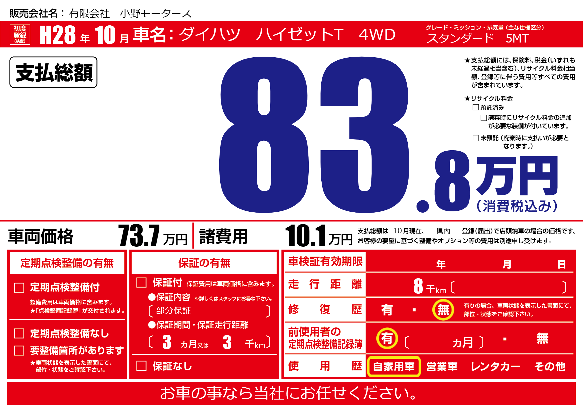 | 車名 | ダイハツ ハイゼットT 4WD | グレード ミッション 排気量 |