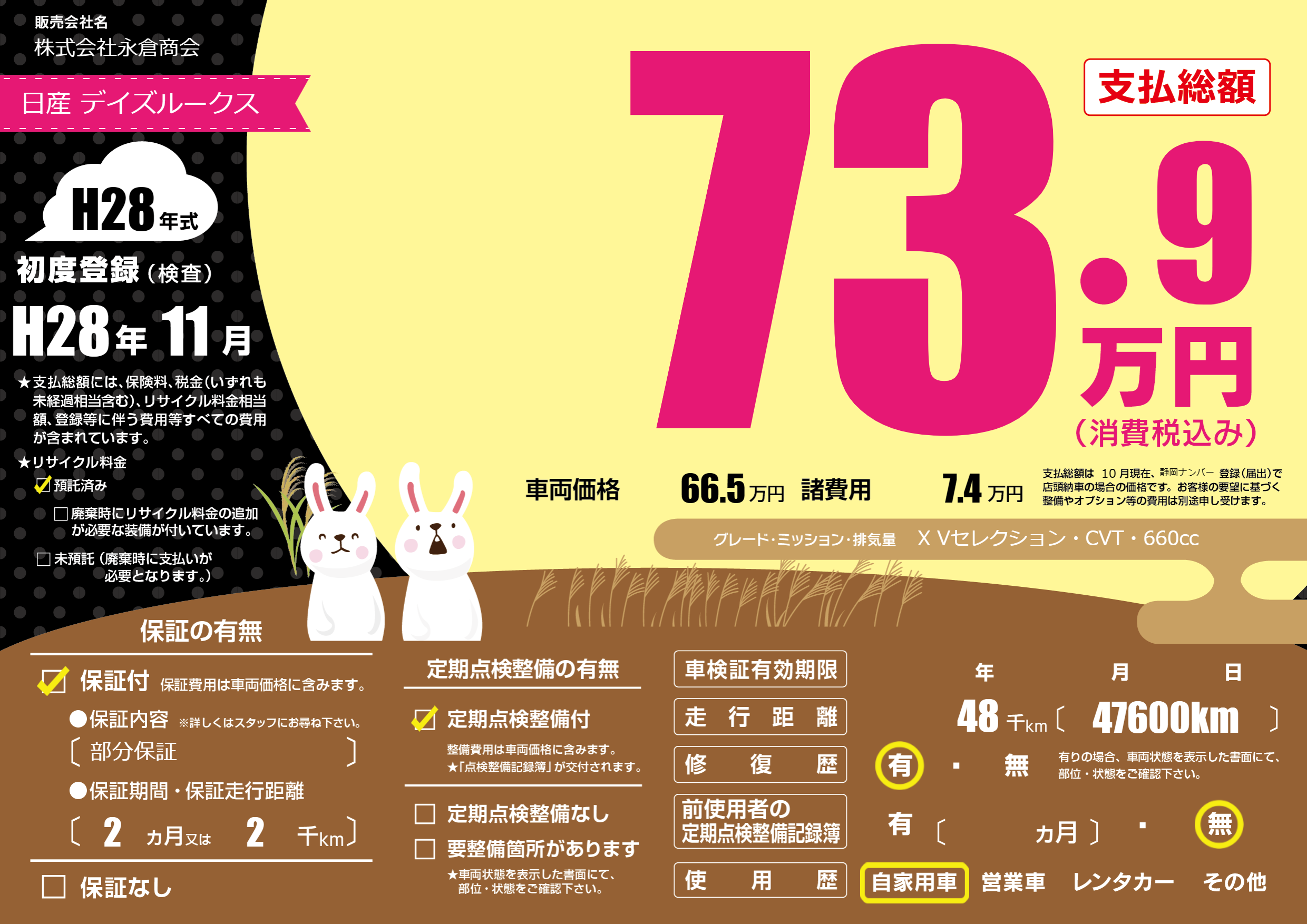 | 走行キロ | 4.8万km | 初年度登録 | H28年11月 |
