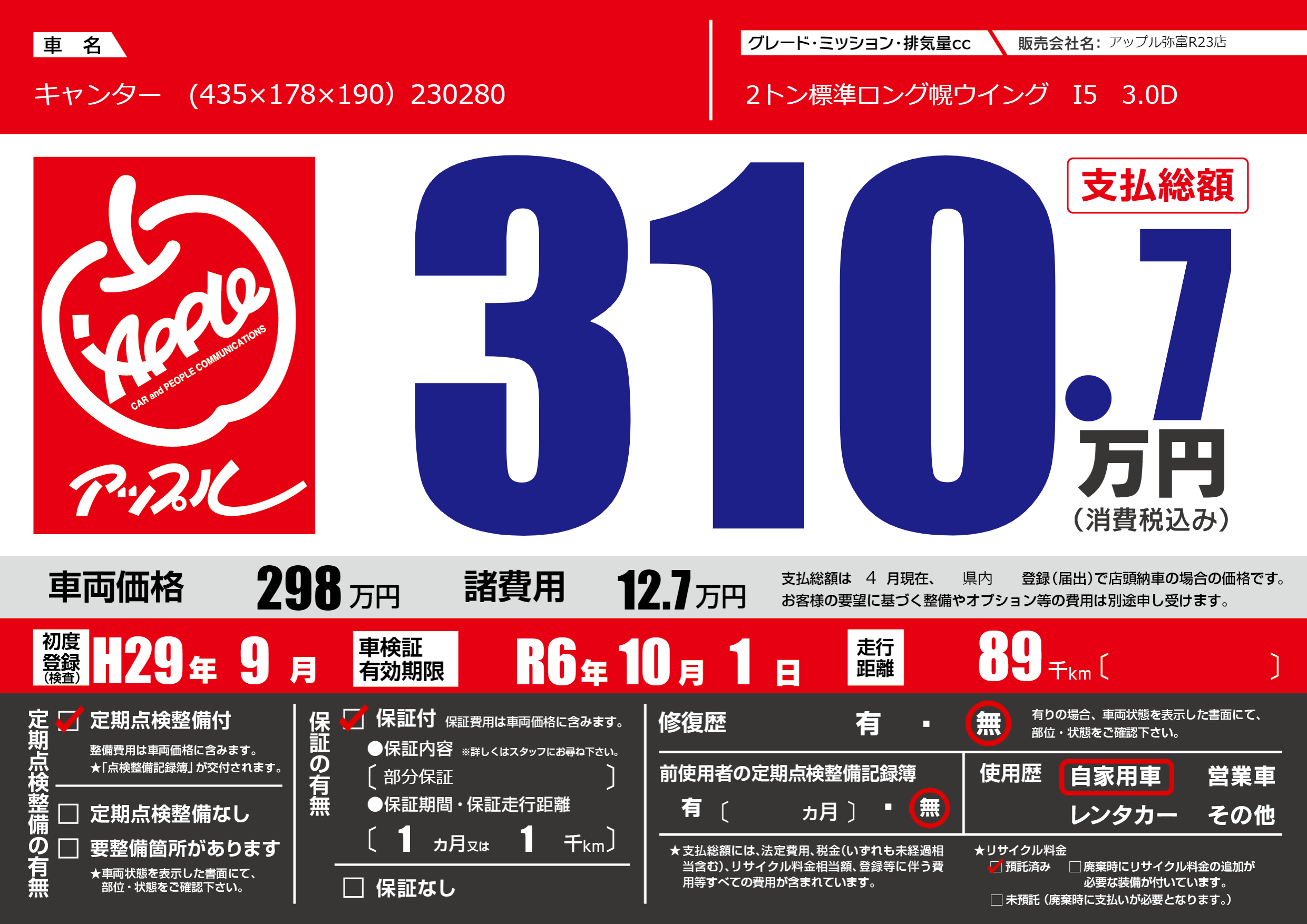 | 車名 | キャンター (435×178×190)230280 | グレード ミッション 排気量 |