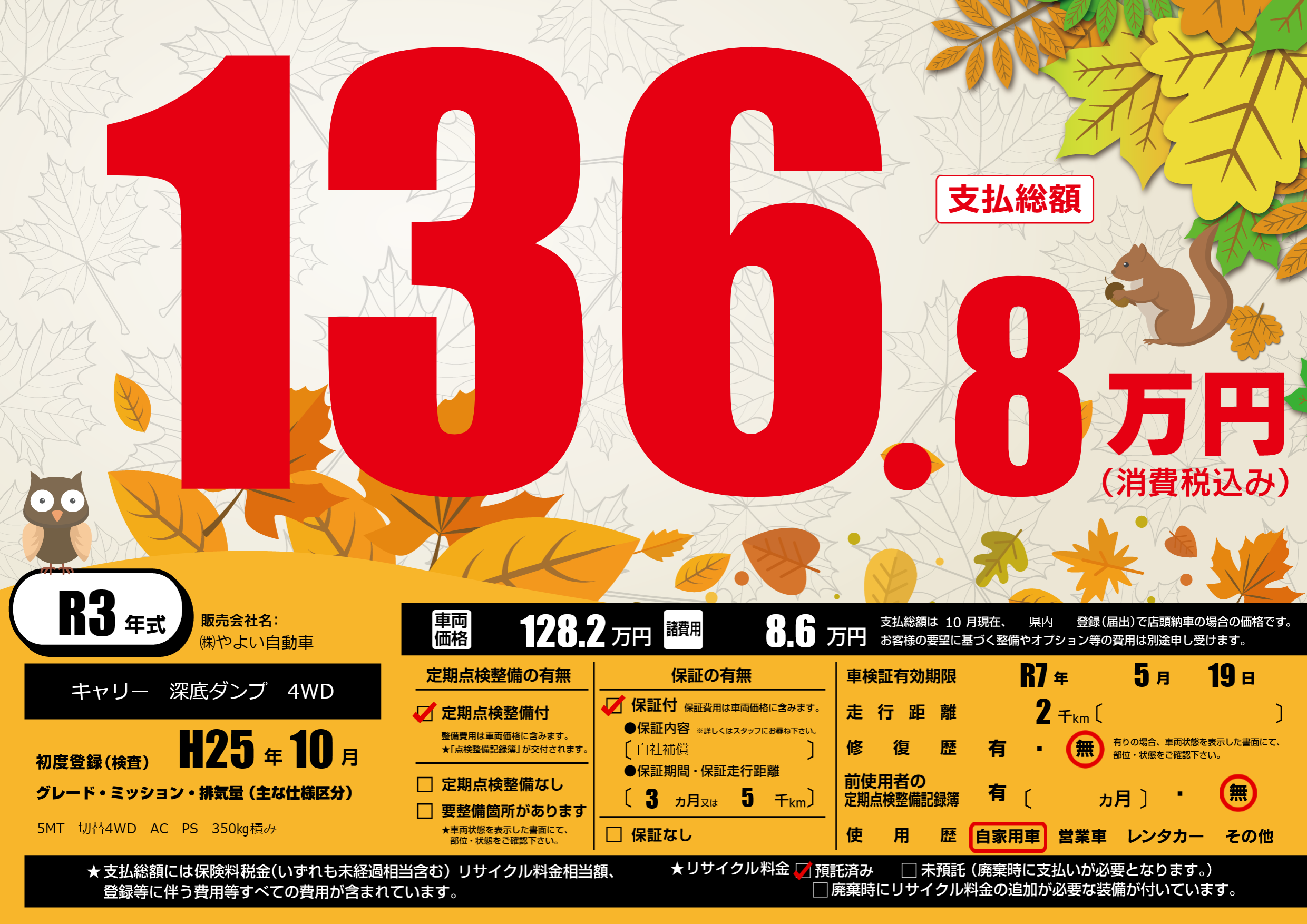 保証付き 保証内容(自社補償) 3ヶ月または(5)千kmまで |