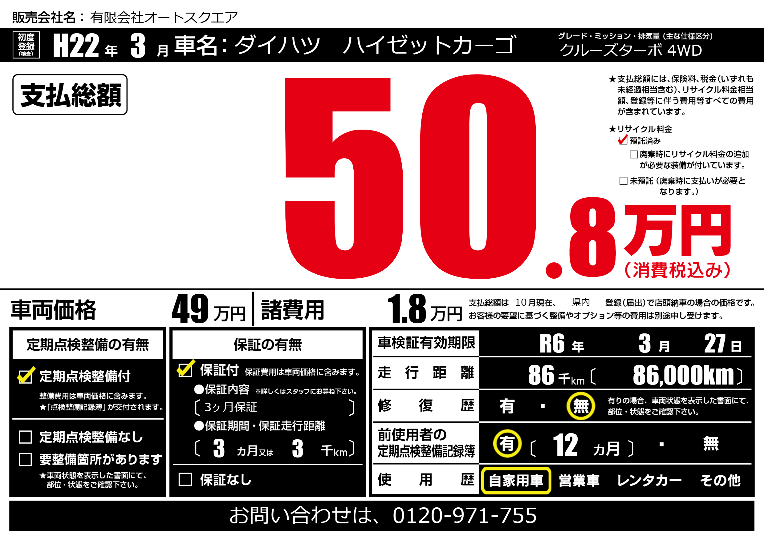 | 走行キロ | 8.6万km | 初年度登録 | H22年3月 |