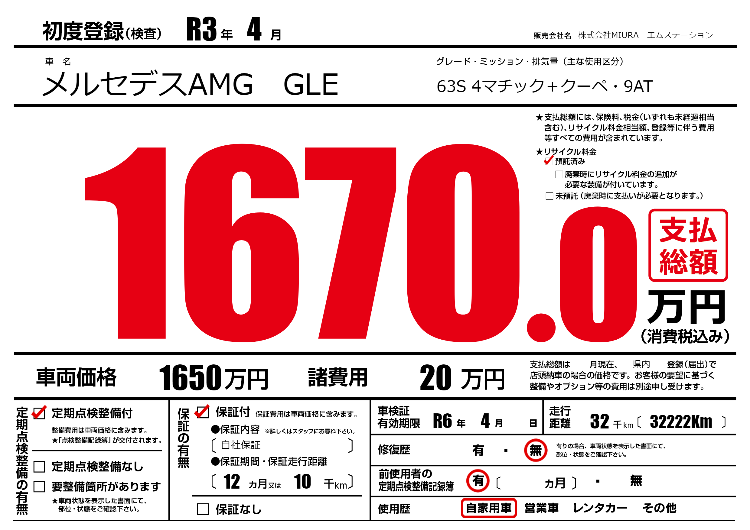 | 車名 | メルセデスAMG GLE | グレード ミッション 排気量 |