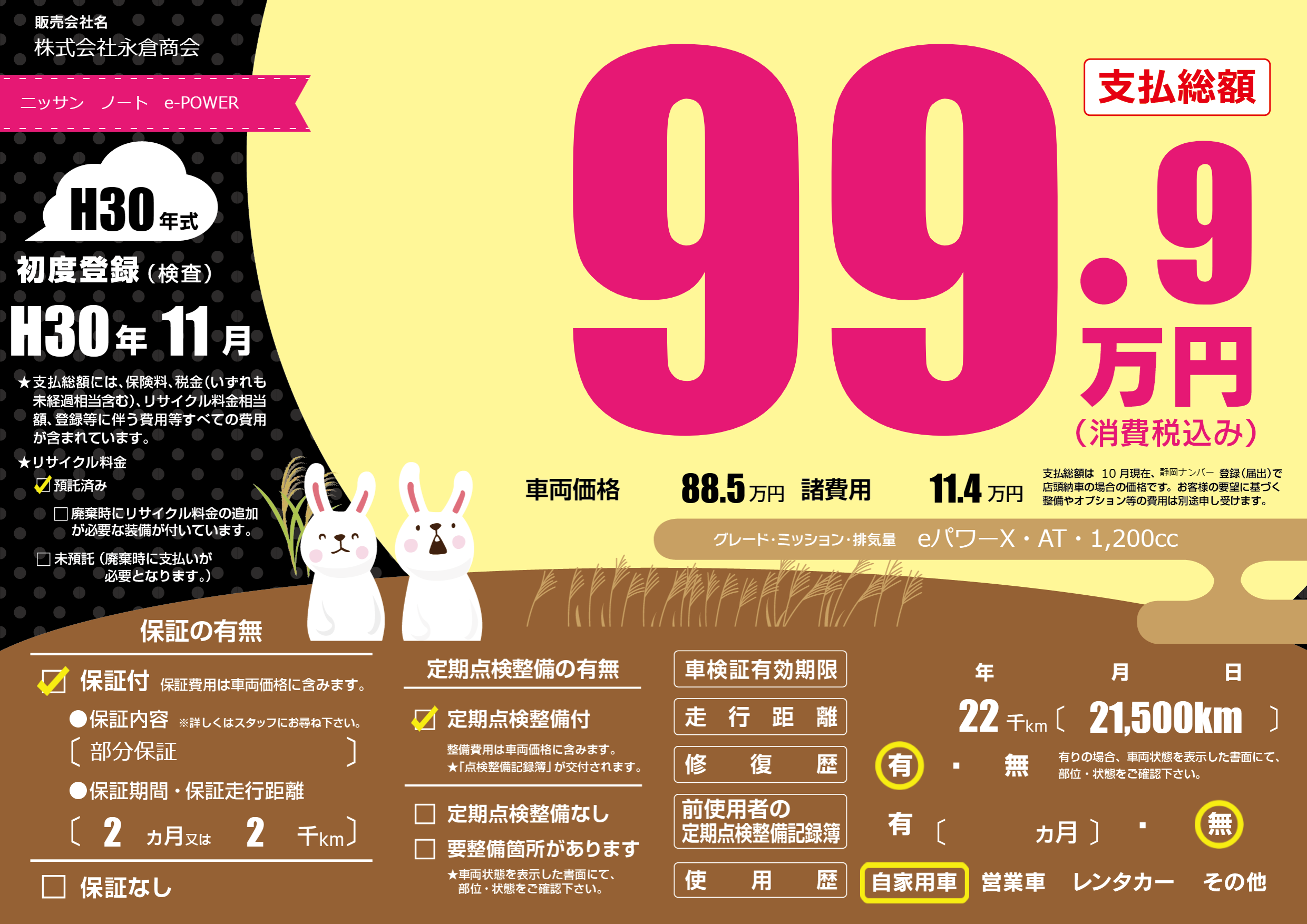 | 車名 | ニッサン ノート e-POWER | グレード ミッション 排気量 |
