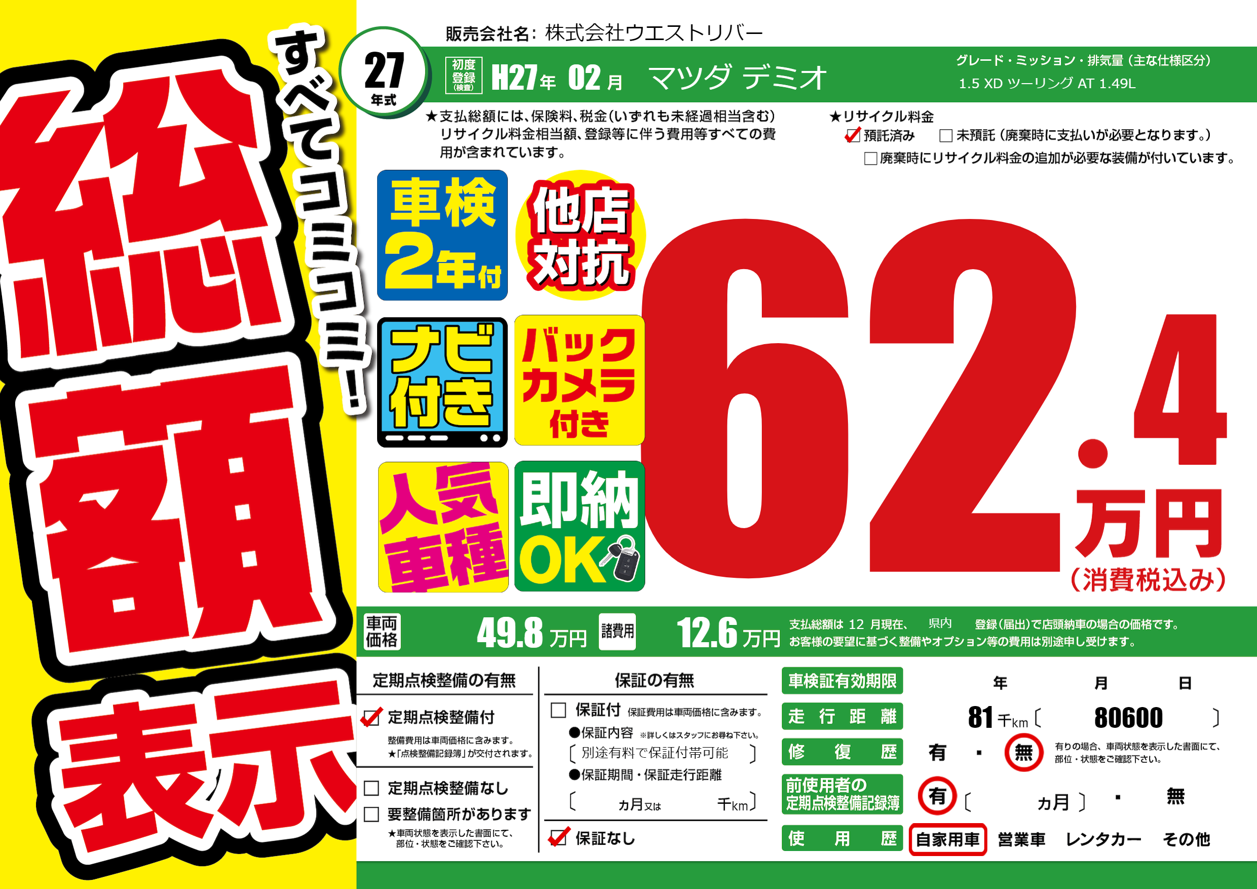 | 走行キロ | 8.1万km | 初年度登録 | H27年02月 |