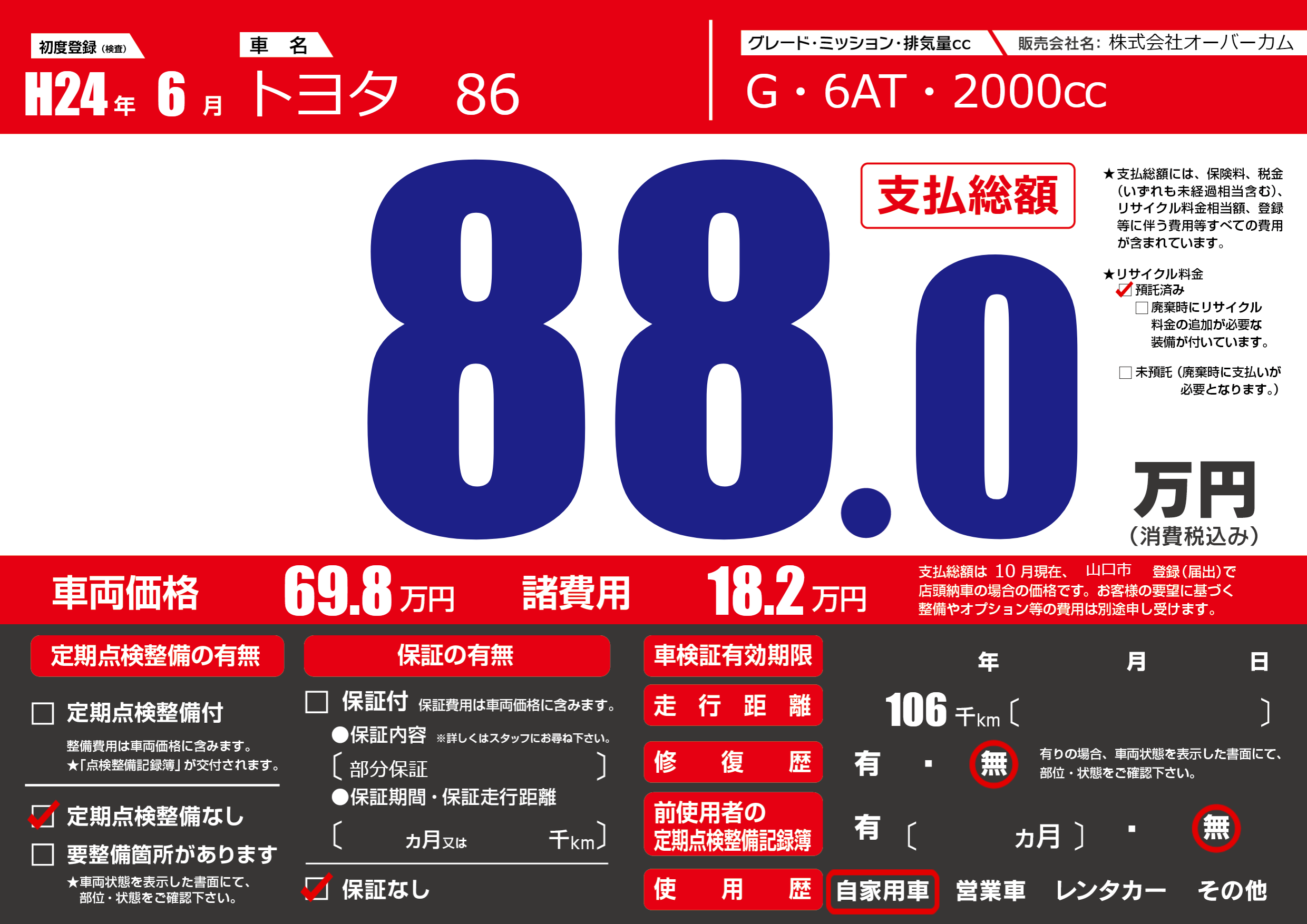 | 車名 | トヨタ 86 | グレード ミッション 排気量 |