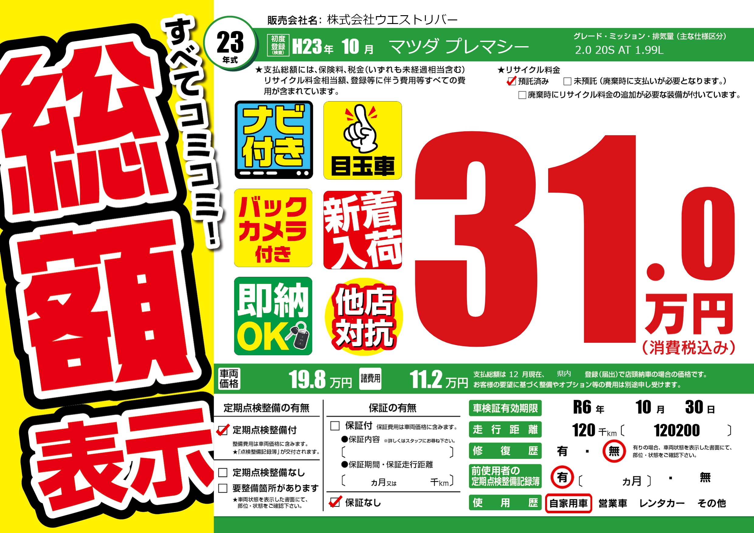 | 走行キロ | 12万km | 初年度登録 | H23年10月 |