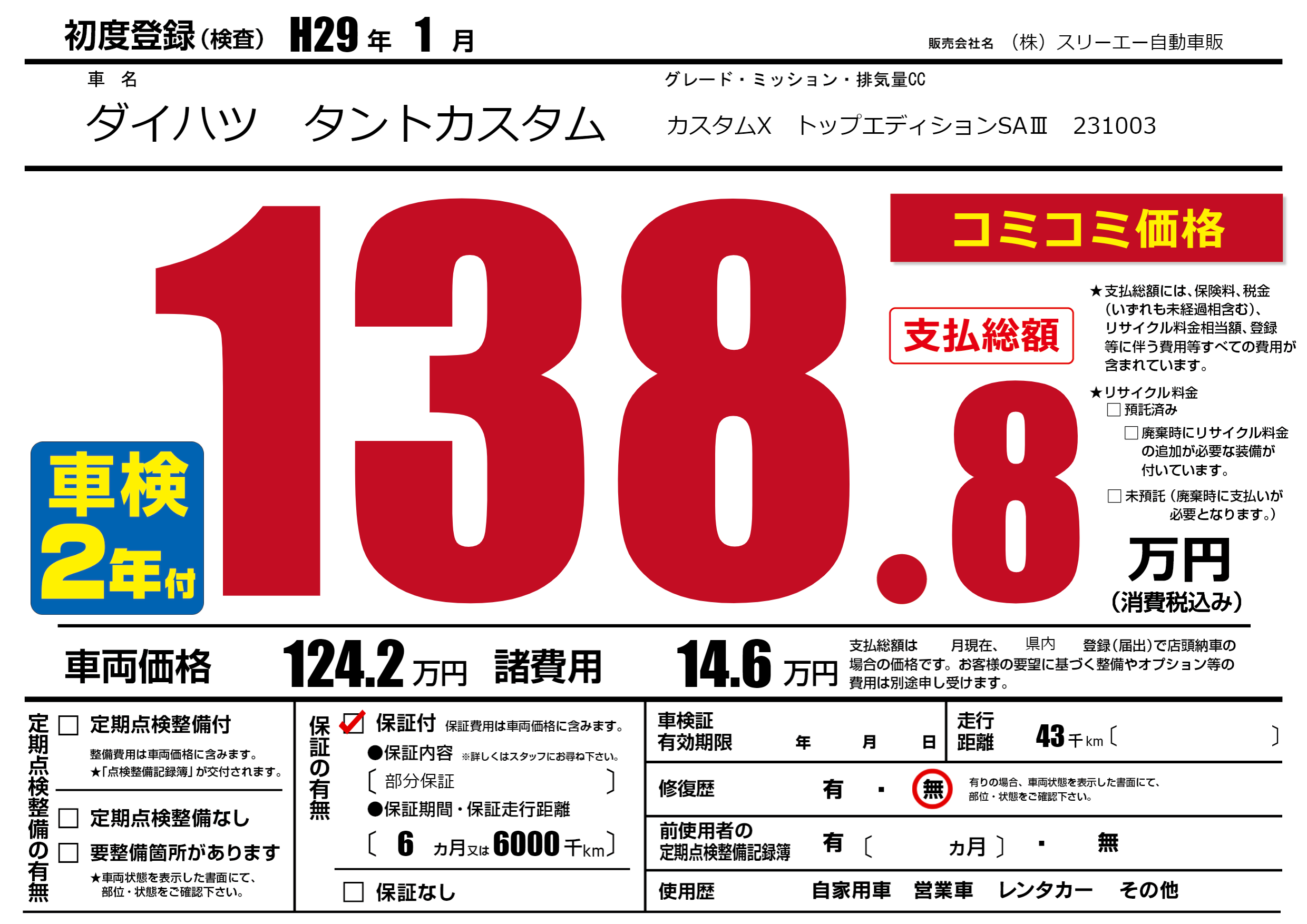保証付き 保証内容(部分保証) 6ヶ月または(6000)千kmまで |