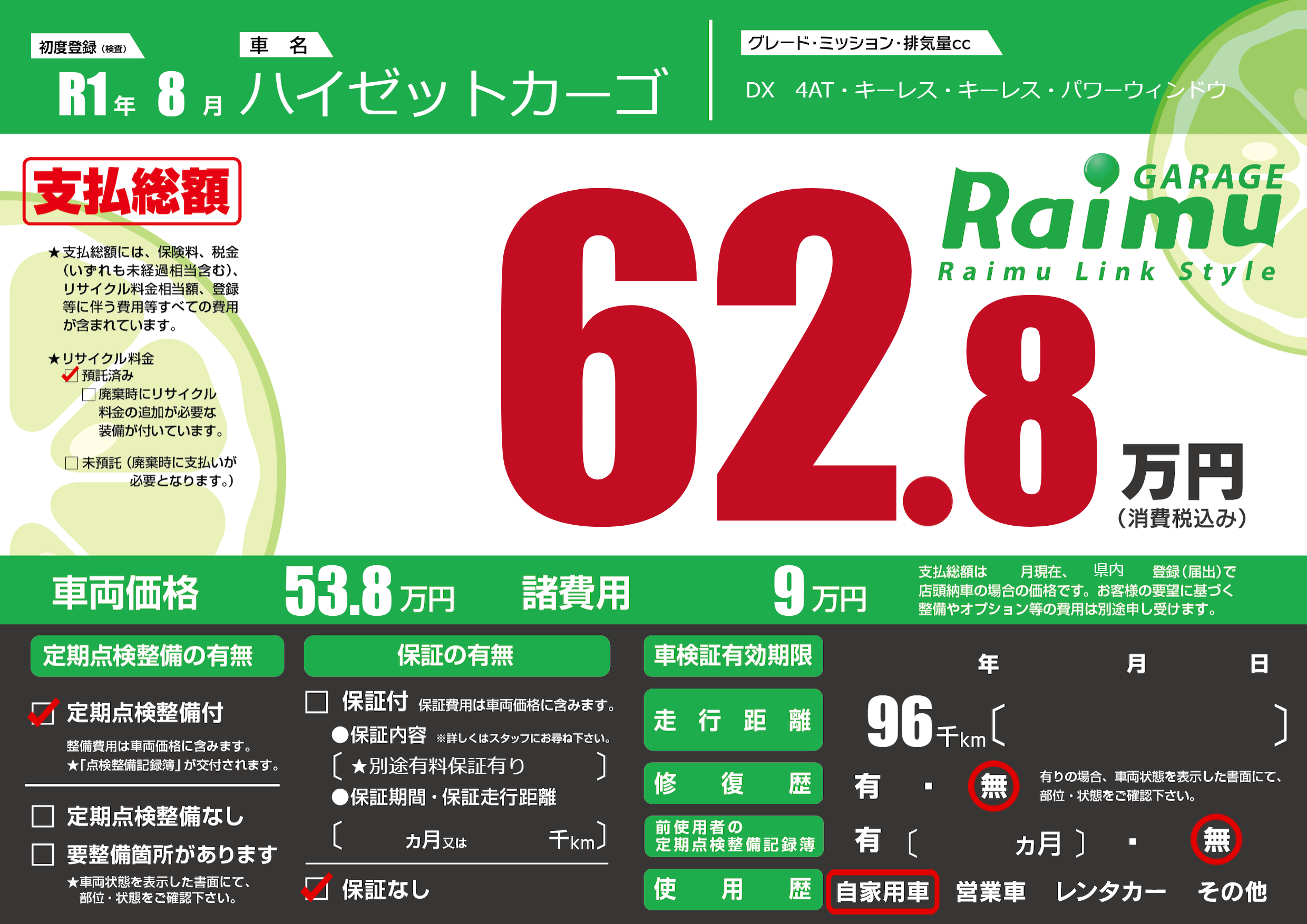 保証なし 保証内容(★別途有料保証有り) ---ヶ月または()千kmまで |