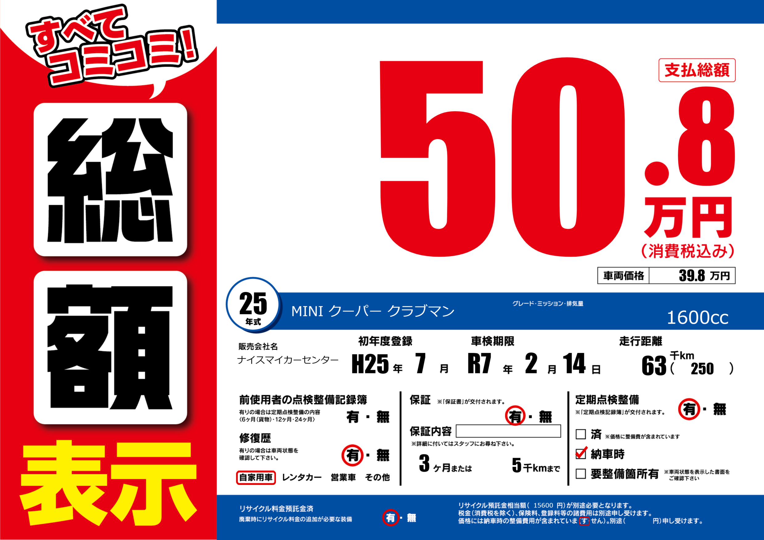 | 定期点検整備 | 定期点検整備あり 納車時あり | ||